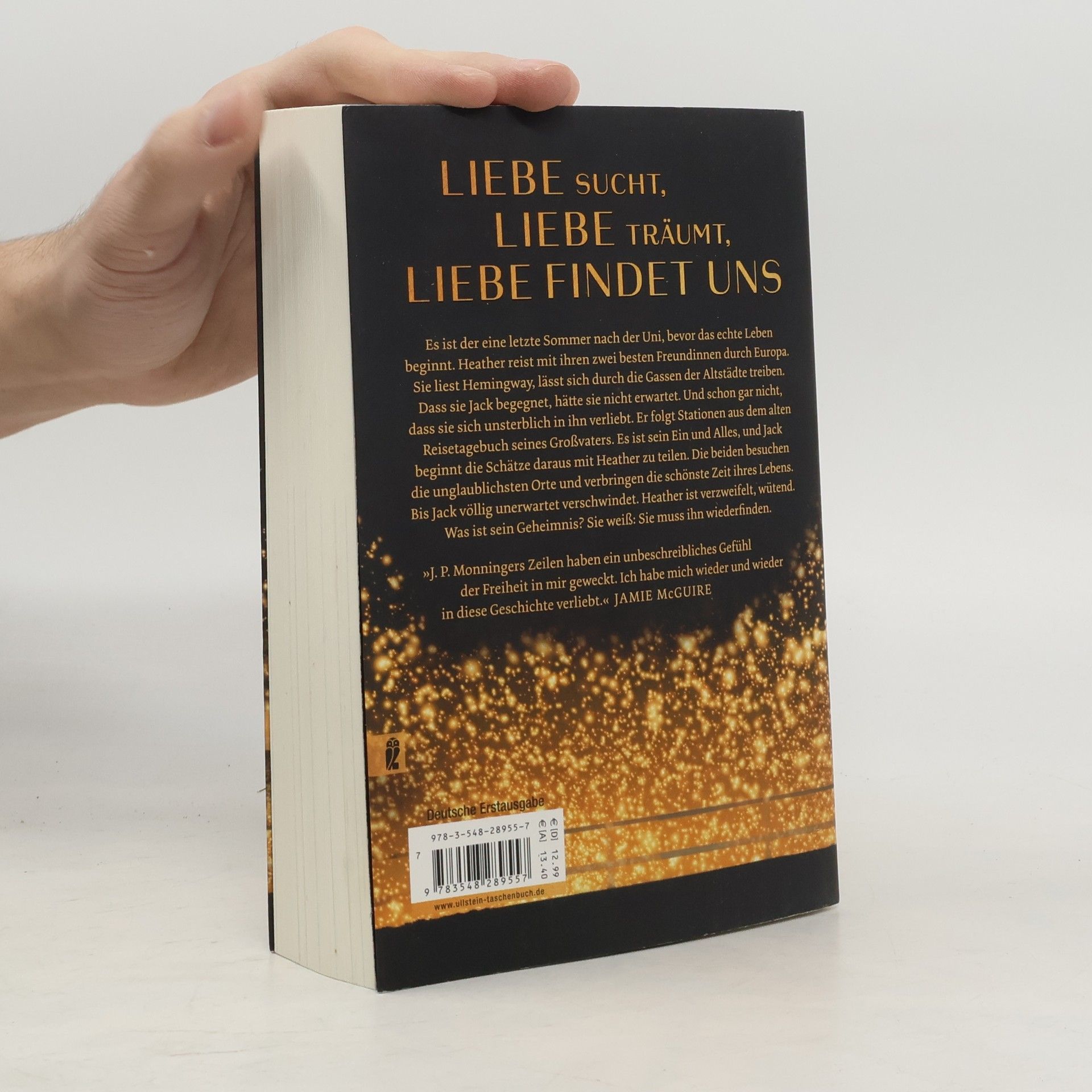 Liebe sucht, Liebe träumt, Liebe findet uns Es ist der eine letzte Sommer nach der Uni, bevor das echte Leben beginnt. Heather reist mit ihren zwei besten Freundinnen durch Europa. Sie liest Hemingway, lässt sich durch die Gassen der Altstädte treiben. Dass sie Jack begegnet, hätte sie nicht erwartet. Und schon gar nicht, dass sie sich unsterblich in ihn verliebt. Er folgt Stationen aus dem alten Reisetagebuch seines Großvaters. Es ist sein Ein und Alles, und Jack beginnt die Schätze daraus mit Heather zu teilen. Die beiden besuchen die unglaublichsten Orte und verbringen die schönste Zeit ihres Lebens. Bis Jack völlig unerwartet verschwindet. Heather ist verzweifelt, wütend. Was ist sein Geheimnis? Sie weiß: Sie muss ihn wiederfinden. »Romantisch und unvergesslich« – Nicholas Sparks »J. P. Monningers Zeilen haben ein unbeschreibliches Gefühl der Freiheit in mir geweckt. Ich habe mich wieder und wieder in diese Geschichte verliebt.« – Jamie McGuire