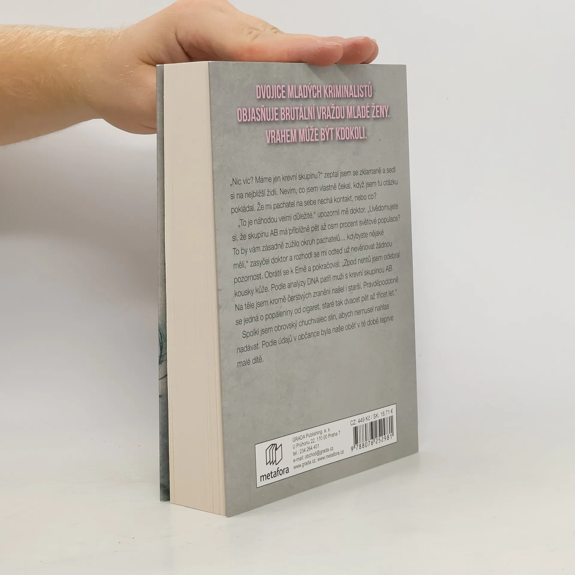 V bohem zapomenuté chatové osadě na východním Slovensku nacházejí dva mladíci zavražděnou ženu. Její totožnost je velkou neznámou. Případ řeší svérázný detektiv David Meizner, věčně nevrlý a nepříjemný sukničkář, který nemá lidi příliš v lásce, a jeho krásná a věcná kolegyně Ema Kopecká. Aby odhalili totožnost vraha, musejí se společně prodrat pavučinou utkanou z dávných tajemství. Jejich pátrání se však komplikuje…Drama plné zvratů a nečekaných událostí se hemží podezřelými postavami z minulosti i současnosti, dávno zapomenutými hříchy, ale i bolestí a utrpením, které musela malá holčička a později mladá žena prožít. Děj nás postupně zavede do malé vesničky pod Tatrami, aby pokračoval do hlavního města a zpět na místo, kde měla hlavní hrdinka nečekanou schůzku se smrtí. Příběh rozehraný postavami z masa a krve je napínavý až do samotného konce a překvapí nečekaným rozuzlením.Vychází v překladu Ľubici Hricoviniové.