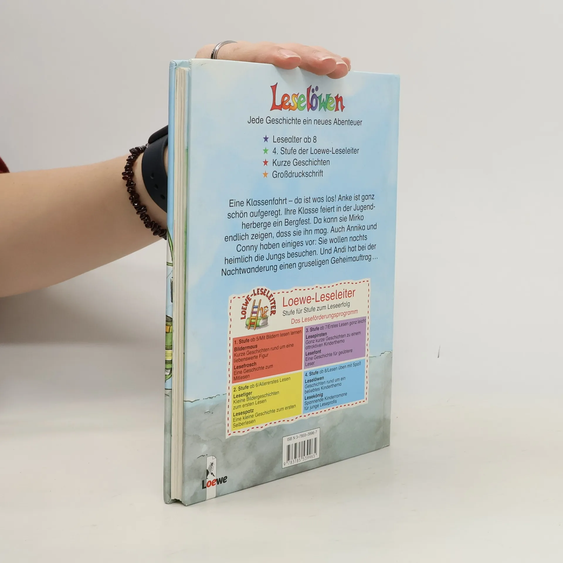 Lesealter ab 8 4. Stufe der Loewe-Leseleiter Kurze Geschichten Großdruckschrift Eine Klassenfahrt - da ist was los! Anke ist ganz schön aufgeregt. Ihre Klasse feiert in der Jugendherberge ein Bergfest. Da kann sie Mirko endlich zeigen, dass sie ihn mag. Auch Annika und Conny haben einiges vor: Sie wollen nachts heimlich die Jungs besuchen. Und Andi hat bei der Nachtwanderung einen gruseligen Geheimauftrag.