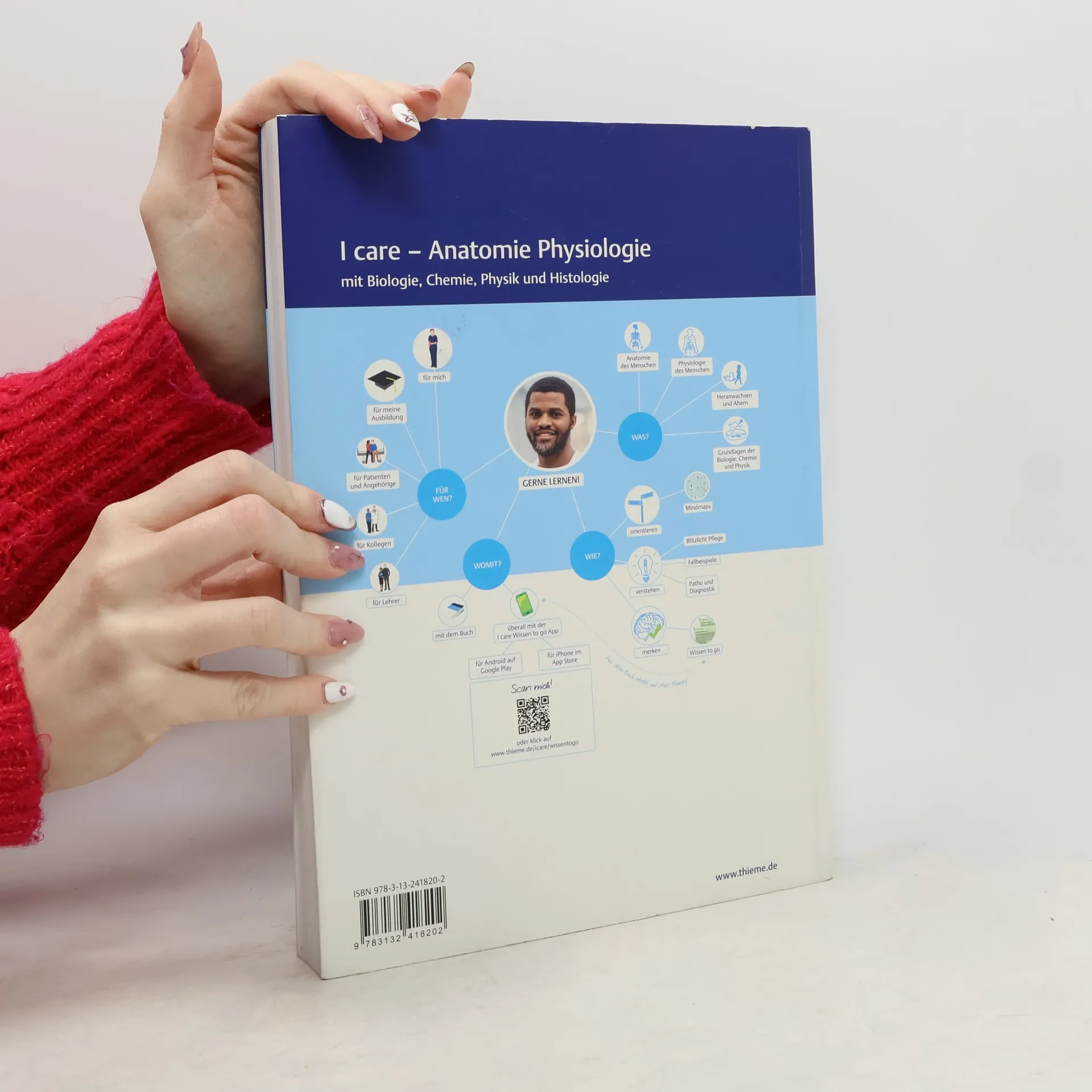 Mit I care legst du den Grundstein für deine generalistische Pflegeausbildung und startest optimal in deinen neuen Lebensabschnitt. Das interaktive und vernetzte Pflegewissen wird dir auf deinem Weg zur Pflegefachfrau oder zum Pflegefachmann vermittelt. Du lernst die Grundlagen der Anatomie und Physiologie, unterstützt durch detaillierte Grafiken, und hast Zugang zu digitalen Inhalten auf icare.thieme.de. Mindmaps zu Beginn der Kapitel helfen dir, die Themen schnell zu erfassen, während Infografiken komplexe Sachverhalte verständlich machen. Das Buch ist aus deiner Perspektive geschrieben und bietet wichtige Zusammenhänge zwischen Anatomie, Krankheit und Pflege. WISSEN TO GO Kästen fassen die Lerninhalte kompakt zusammen, und die kostenlose App unterstützt dich beim Lernen mit interaktiven Funktionen. Praxisnahe Fallbeispiele verdeutlichen, wie Krankheiten die Körperfunktionen beeinflussen, und Lernkontrollfragen helfen dir, das Wissen zu reflektieren. Die Themen umfassen Grundlagen der Anatomie, Physiologie, Biologie und die Entwicklung vom Neugeborenen bis zum alten Menschen. I care bietet dir eine verständliche Lernerfahrung, die die Anforderungen der Ausbildungs- und Prüfungsverordnung sowie des Pflegeberufegesetzes integriert. Die drei Bände sind grafisch und inhaltlich aufeinander abgestimmt und bieten eine optimale Vorbereitung auf den Pflegealltag und Prüfungen. Die Inhalte wurden in Zusammenarbeit mit Experten aus