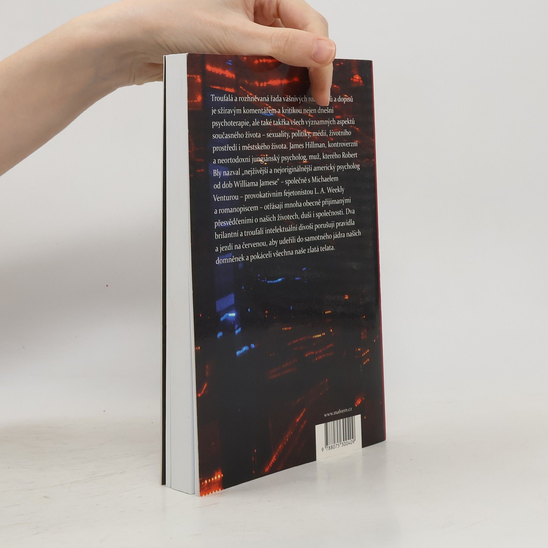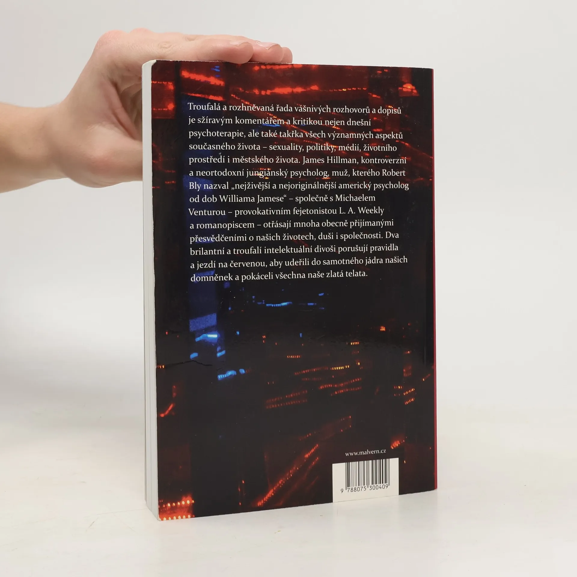 Troufalá a rozhněvaná řada vášnivých rozhovorů a dopisů je sžíravým komentářem a kritikou nejen dnešní psychoterapie, ale také takřka všech významných aspektů současného života – sexuality, politiky, médií, životního prostředí i městského života. James Hillman, kontroverzní a neortodoxní jungiánský psycholog, muž, kterého Robert Bly nazval „nejživější a nejoriginálnější americký psycholog od dob Williama Jamese“ – společně s Michaelem Venturou – provokativním fejetonistou L. A. Weekly a romanopiscem – otřásají mnoha obecně přijímanými přesvědčeními o našich životech, duši i společnosti. Dva brilantní a troufalí intelektuální divoši porušují pravidla a jezdí na červenou, aby udeřili do samotného jádra našich domněnek a pokáceli všechna naše zlatá telata.