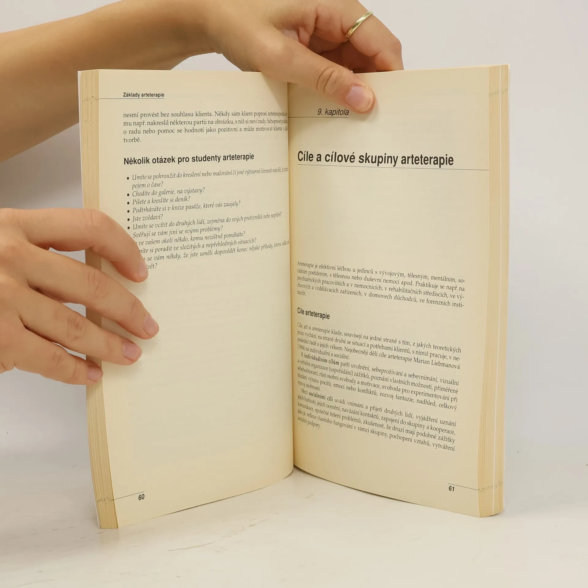 Autorka nabízí přehled teoretických východisek arteterapie a vyčleňuje cílové skupiny klientů, pro něž je vhodná. Přibližuje cíle arteterapie, které spočívají hlavně v budování komunikace, kreativity, spontaneity, nacházení smyslu života a kompenzace případného handicapu. Kniha se zabývá kresbou a malbou v kontextu arteterapie, největší prostor však dostává činnost s hlínou, protože autorka, profesí sochařka, využívá při práci s postiženými dětmi především modelování z hlíny. Jsou zde popsány jednotlivé arteterapeutické techniky práce s hlínou a způsoby jejich aplikace pro různé cílové skupiny klientů. Práce je doplněna 15 kazuistikami, které ilustrují účinky arteterapie.