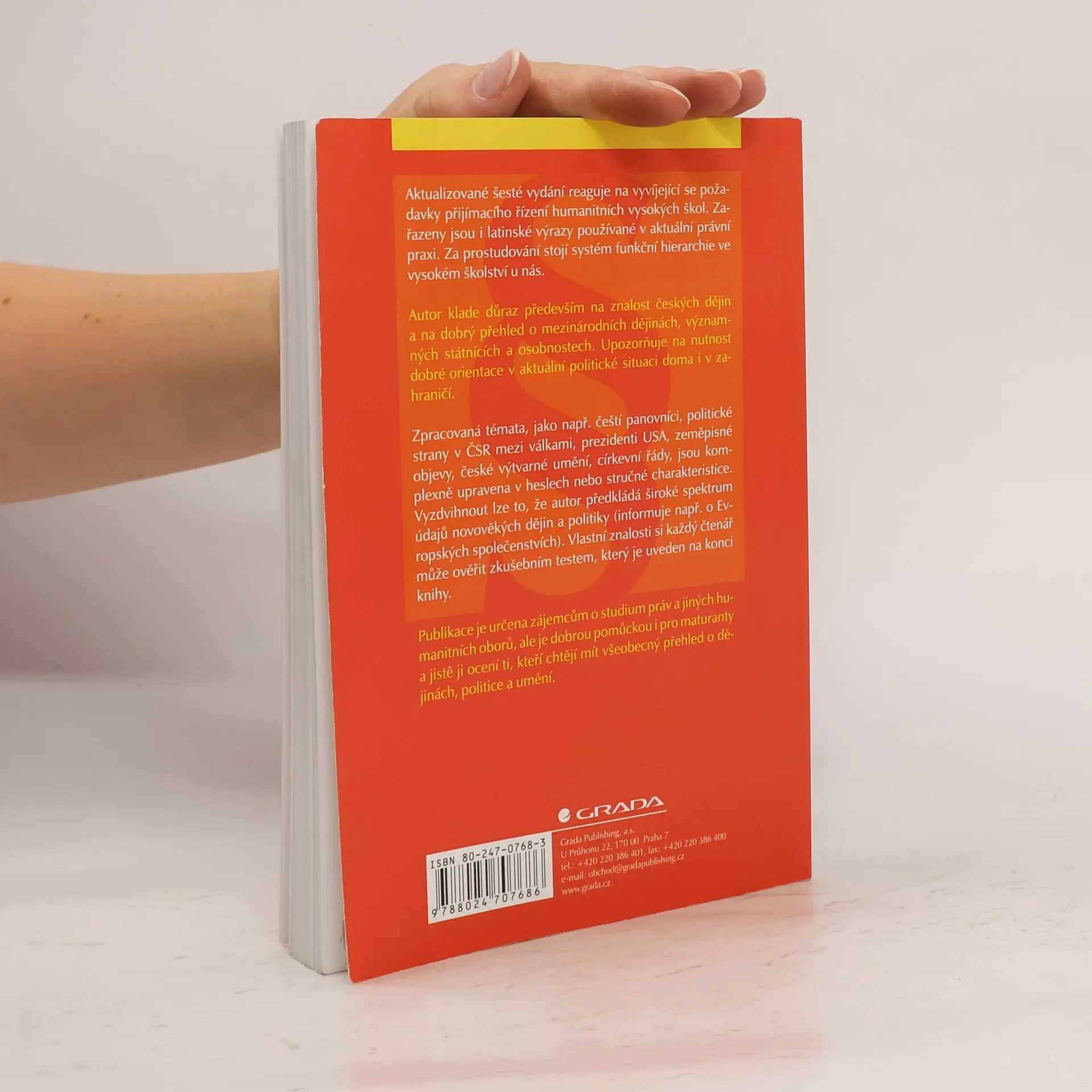 Nové vydání je aktualizováno v souladu s vyvíjejícími se požadavky právnických fakult - je zařazena teorie práva s latinskými základy, přehled funkční hierarchie ve vysokém školství u nás a cvičný test. Kniha je zpracována formou výpisků a je dobrou pomůckou i pro maturanty z humanitních oborů a uchazeče o studium na humanitních VŠ. Určena je také těm, kteří chtějí mít přehled o událostech českých a světových dějin, našich i zahraničních osobnostech, dějinách umění, ústavním vývoji a základech práva.