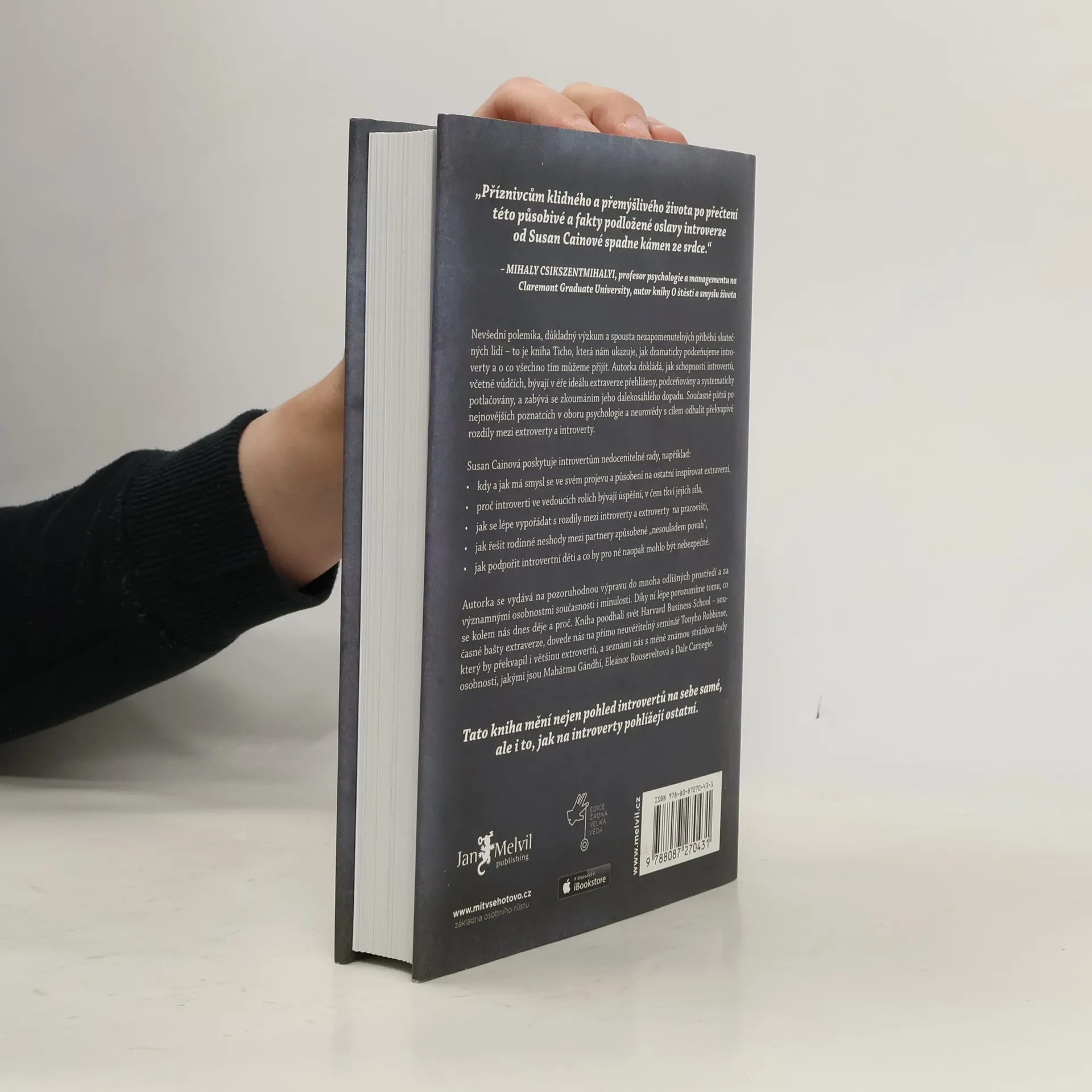 Kolik skutečných introvertů znáte? Odpověď vás možná překvapí. V kultuře, která nás od základní školy až po byznys vychovává k týmové práci, je vše nastavené pro úspěch extrovertů. Až díky této knize získali ti tiší svou mluvčí: Susan Cainovou. Její čtivý, důkladný a překvapivý text o tiché síle introvertů se stal velice rychle bestsellerem a autorka celebritou. Je to paradox, když sama o sobě prohlašuje, že je introvertem?