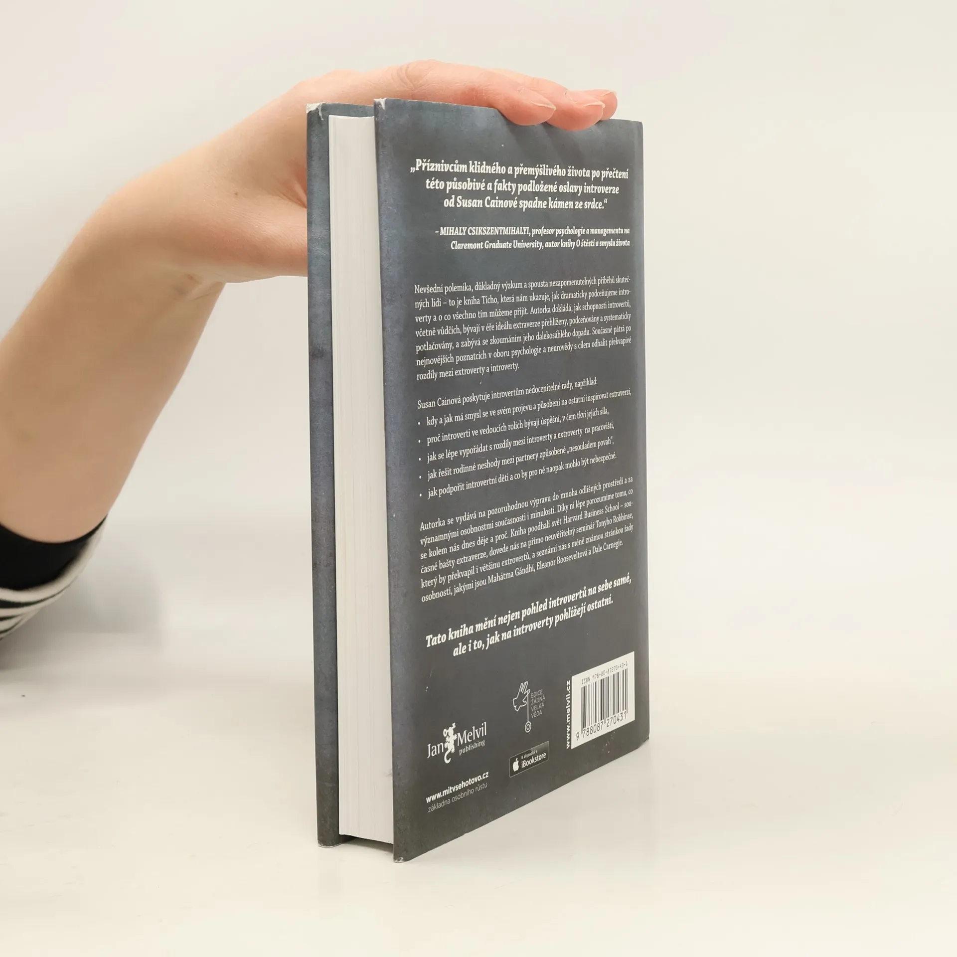 Kolik skutečných introvertů znáte? Odpověď vás možná překvapí. V kultuře, která nás od základní školy až po byznys vychovává k týmové práci, je vše nastavené pro úspěch extrovertů. Až díky této knize získali ti tiší svou mluvčí: Susan Cainovou. Její čtivý, důkladný a překvapivý text o tiché síle introvertů se stal velice rychle bestsellerem a autorka celebritou. Je to paradox, když sama o sobě prohlašuje, že je introvertem?