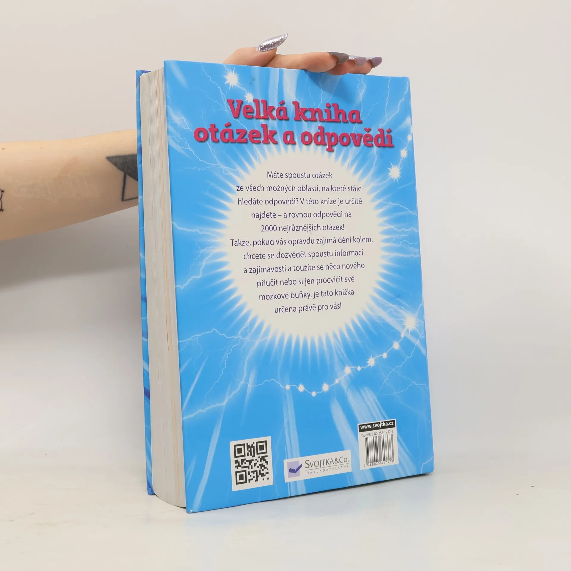 Kolik má ramen chobotnice? Které stromy vyrostou nejvýše? Kdo hrál úplně první počítačové hry? Co je Mléčná dráha? Které je nejrychlejší auto na světě? Co to znamená fair play? Existuje opravdová kouzelnická škola? Kdo má první pozdravit? Víte všechno o zvířatech nebo o astrologii? Zajímá vás, proč se některé věci nebo činnosti nazývají tak, jak se nazývají? Nebo snad máte zájem o největší světové rekordy? Víte, jak a proč se věci na světě dějí? A co všechno víte o sportu, kouzlech, magii a čarodějnictví nebo o základech slušného chování? Chcete vědět všechno o tom, co se děje kolem aut? Máte spoustu otázek ze všech možných oblastí, na které stále hledáte odpovědi? V této knize je určitě najdete – a rovnou odpovědi na 2000 nejrůznějších otázek!