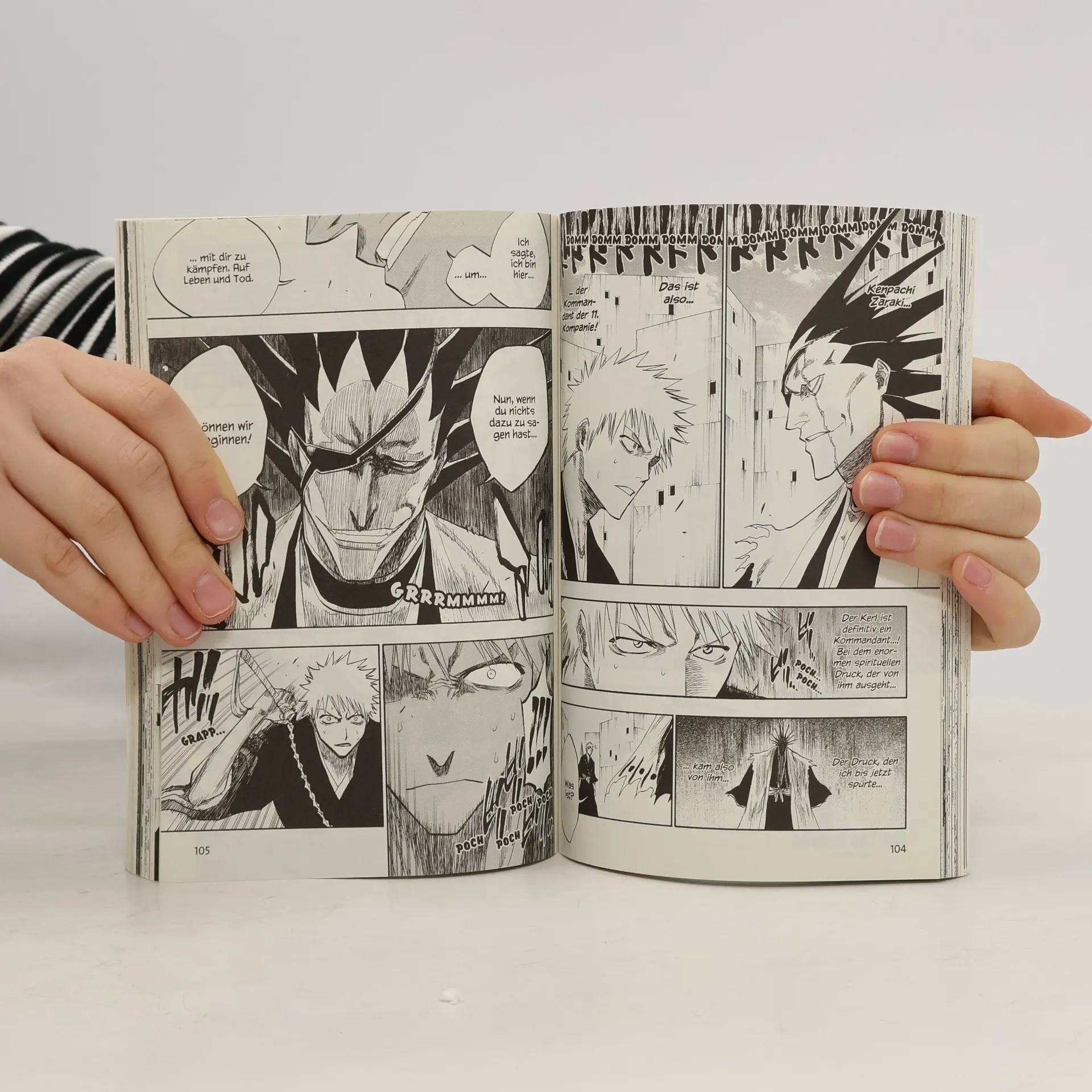 „Ich genehmige hiermit den übergeordneten Rängen, inklusive der Vizekommandanten, das Tragen von Zanpakuto innerhalb des Seireitei sowie die vollständige Nutzung von Kräften auf Kriegsniveau!“ Dieser Erlass stammt vom General-Kommandanten der 13 Hofgarden. Die Jagd beginnt und Ichigo trifft auf den kampfgestählten Kommandanten Zaraki, dessen spiritueller Druck bereits ausreicht, um ihn in die Knie zu zwingen!