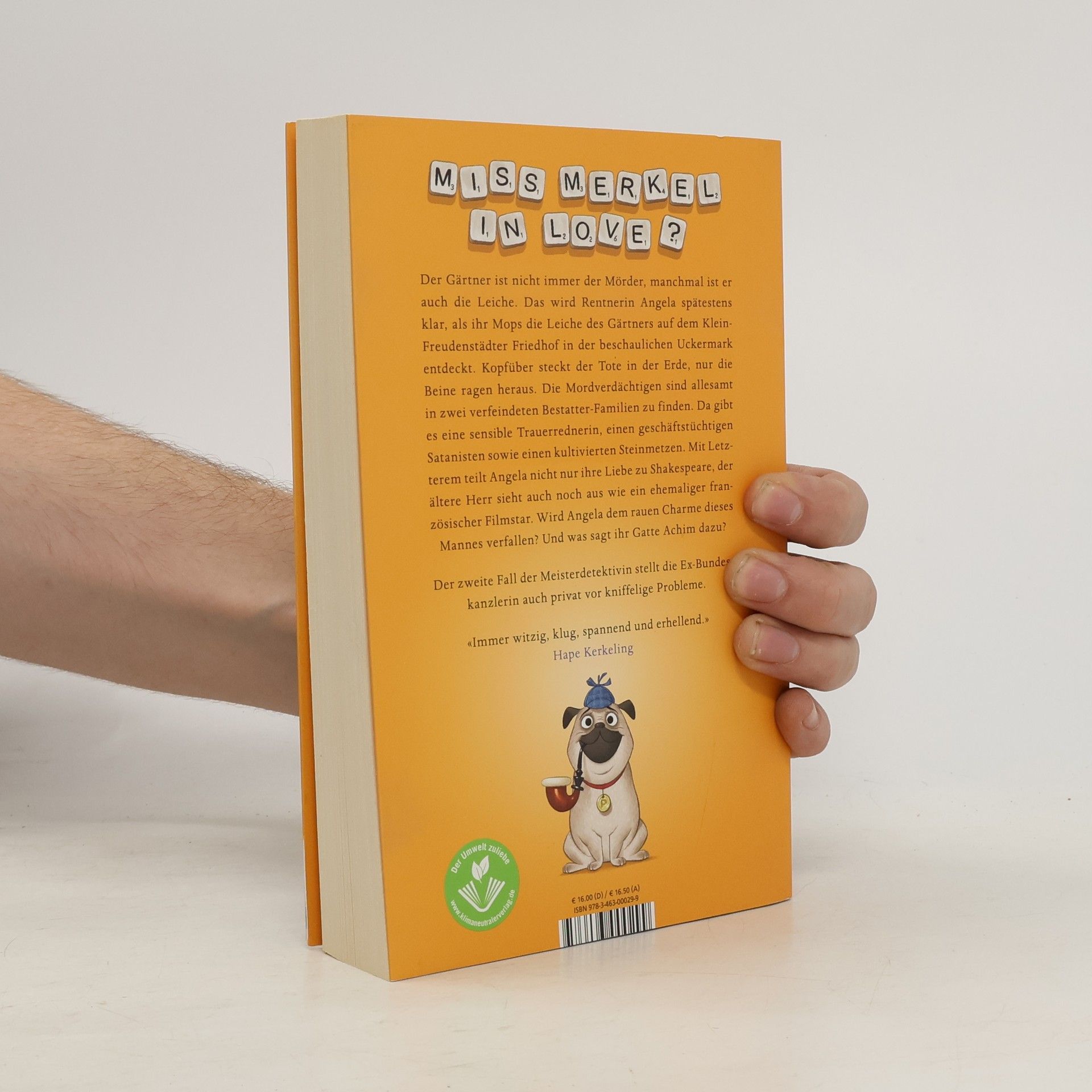 Der Gärtner ist nicht immer der Mörder, manchmal ist er auch die Leiche. Das wird Rentnerin Angela spätestens klar, als ihr Mops die Leiche des Gärtners auf dem Klein-Freudenstädter Friedhof in der beschaulichen Uckermark entdeckt. Kopfüber steckt der Tote in der Erde, nur die Beine ragen heraus. Die Mordverdächtigen sind allesamt in zwei verfeindeten Bestatter-Familien zu finden. Da gibt es einen dubiosen Geschäftsführer, eine spröde Buchhalterin, eine sensible Trauerrednerin, einen Satanisten sowie einen kultivierten Steinmetz. Mit Letzterem teilt Angela nicht nur ihre Liebe zu Shakespeare, der ältere Herr sieht auch noch aus wie ein ehemaliger französischer Filmstar. Wird Angela dem rauen Charme dieses Mannes verfallen? Und was sagt ihr Gatte Achim dazu? Der zweite Fall der Meisterdetektivin Miss Merkel stellt die Ex-Bundeskanzlerin auch privat vor kniffelige Probleme.