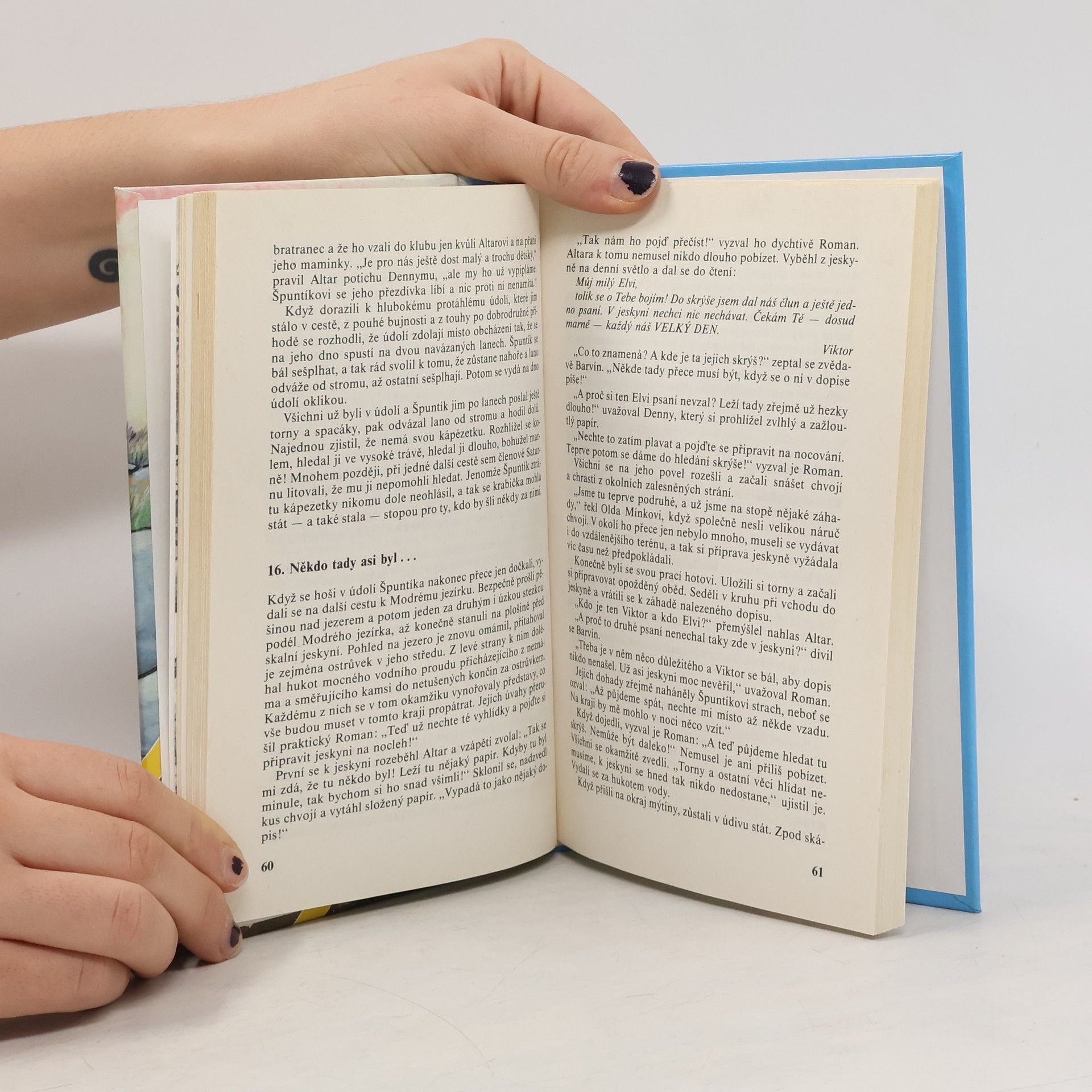 Hlavní postavou knihy je třináctiletý sportovec Denny, který se vážně zraní na kluzišti. V nemocnici se seznámí s vrstevníkem Oldou a ten jej později přivede do klubu Saturn. S novými kamarády prožije Denny mnohá dobrodružství. Jednou se společně vydají do opuštěného lomu pro jakousi namodralou hlínu, kterou vykupují dva kumpáni, Haryk a Milda. Přitom objeví krasovou oblast plnou skalisek a podzemních prostor, částečně nepřístupných. U jezera velké rozlohy přijdou na stopu dvou neznámých školáků a zjistí, že jeden záhadně zmizel a druhý ho marně hledá. Pouze zpola zatopený člun skýtá jakési tragické vysvětlení. Rozhodnou se pomoci kamarádovi v jeho pátrání a rozluštit záhadu. Na tomto nádherném místě vrcholí později jejich příběh prázdninovým táborem. Ilustroval Miroslav Schönberg. Pozdnámka: Na titiluní straně žlutý proužek "1. knižní vydání". Obsahuje doslov Jaroslava Foglara a ediční poznámku (Václav Nosek-Windy). Další vydání byla doplněna o další čtyři kapitoly.