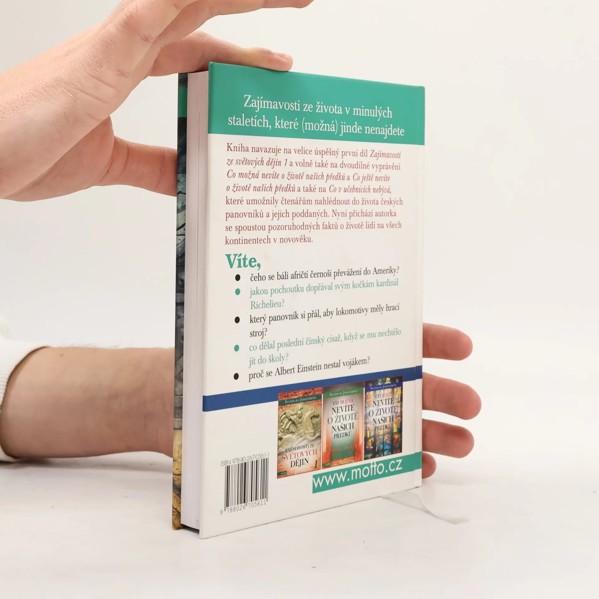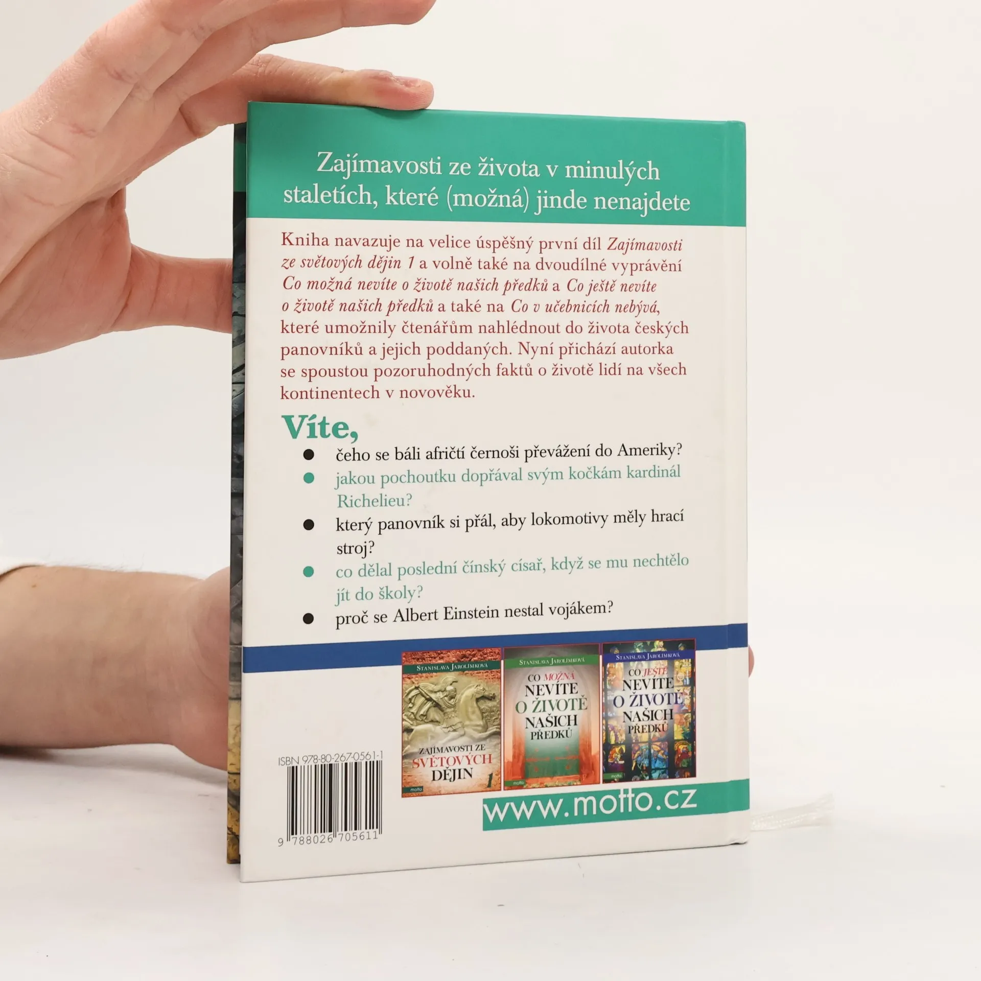 Zajímavosti ze života v minulých staletích, které (možná) jinde nenajdete Kniha navazuje na velice úspěšný první díl Zajímavosti ze světových dějin 1 a volně také na dvoudílné vyprávění Co možná nevíte o životě našich předků a Co ještě nevíte o životě našich předků také naCo v učebnicích nebývá 2, které přinášely řadu zajímavostí ze života českých panovníků a jejich poddaných. Nyní přichází autorka se spoustou zajímavých informací o životě lidí na všech kontinentech v novověku. Víte, čeho se báli afričtí černoši převážení do Ameriky? Jakou pochoutku dopřával svým kočkám kardinál Richelieu? Který panovník si přál, aby lokomotivy měly hrací stroj? Co dělal poslední čínský císař, když se mu nechtělo jít do školy? Proč se Albert Einstein nestal vojákem?