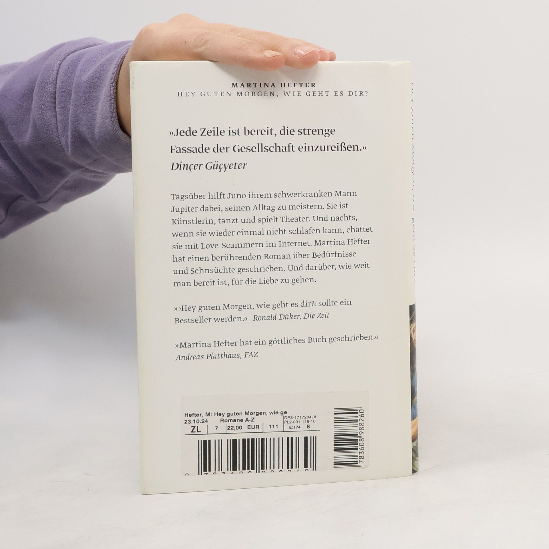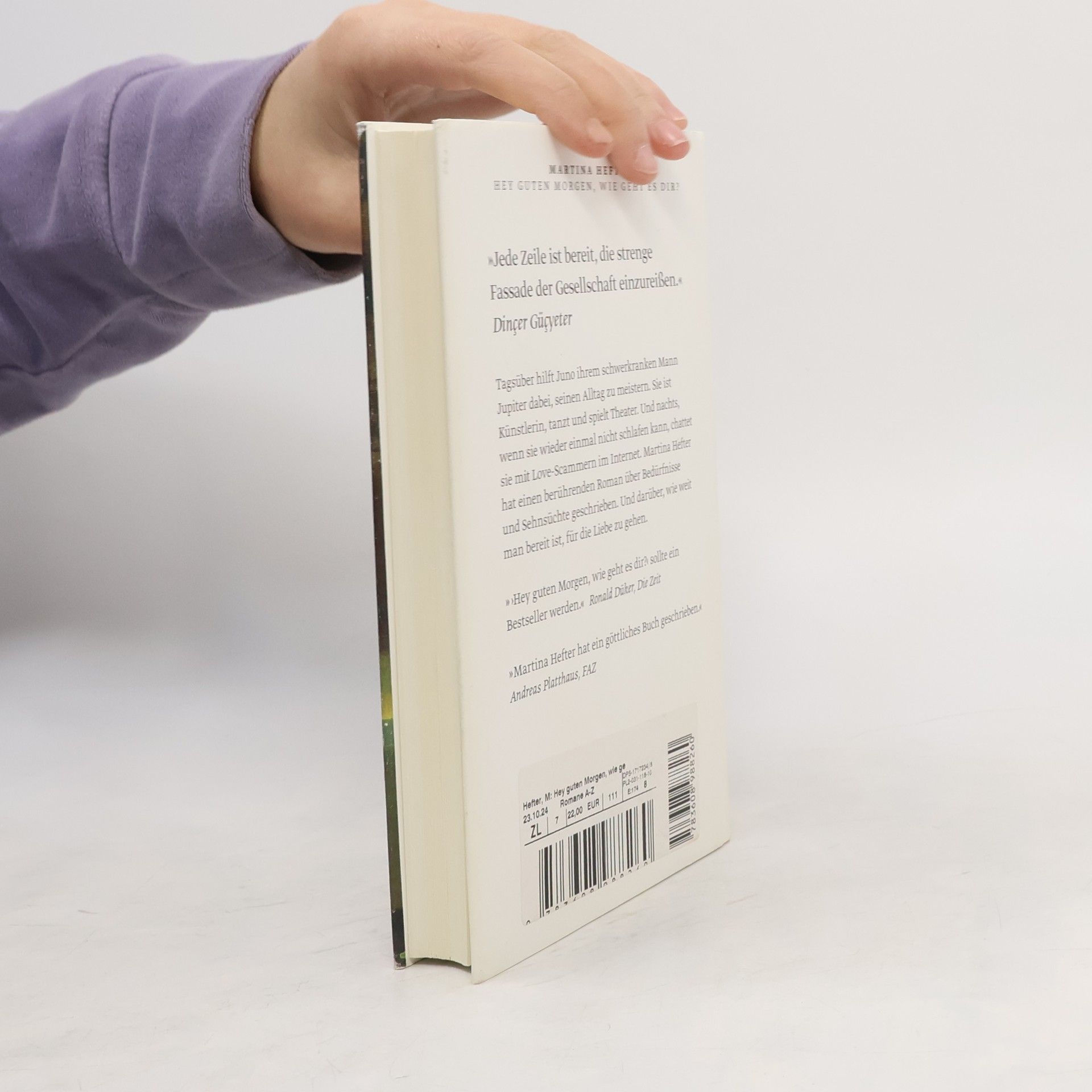 Tagsüber hilft Juno ihrem schwerkranken Mann Jupiter dabei, seinen Alltag zu meistern. Außerdem ist sie Künstlerin, tanzt und spielt Theater. Und nachts, wenn sie wieder einmal nicht schlafen kann, chattet sie mit Love-Scammern im Internet. Martina Hefter hat einen berührenden Roman über Bedürfnisse und Sehnsüchte im Leben geschrieben. Und darüber, wie weit man bereit ist, für die Liebe zu gehen.Juno schreibt online mit Männern, die Frauen online ihre Liebe gestehen und so versuchen, sie um ihr Geld zu bringen. Doch statt darauf hereinzufallen, werden genau diese Männer zu einer Form von Freiheit für Juno. In den Gesprächen kann sie sein, wer sie will und sagen, was sie will – und das vermeintlich ohne Konsequenzen. Ganz im Gegensatz zu ihrem sonstigen Leben, in dem sie immer unterwegs, immer besorgt um Jupiter, immer beschäftigt und eingebunden ist. Also flüchtet Juno ab und zu vor ihrem Alltag ins Internet und spielt dort Spielchen mit Männern, die sie anlügen. Sie selbst wird zur Lügnerin. Aber ist es nicht so, dass man sich beim Lügen zuallererst selbst belügt? Eines Tages trifft Juno auf Benu, der ihre Behauptungen ebenso durchschaut wie sie seine. Und trotz der Entfernung zwischen ihnen entsteht eine Verbindung. »Hey guten Morgen, wie geht es dir« ist ein tiefgehender Roman, aber so leichtfüßig wie eine Komödie.