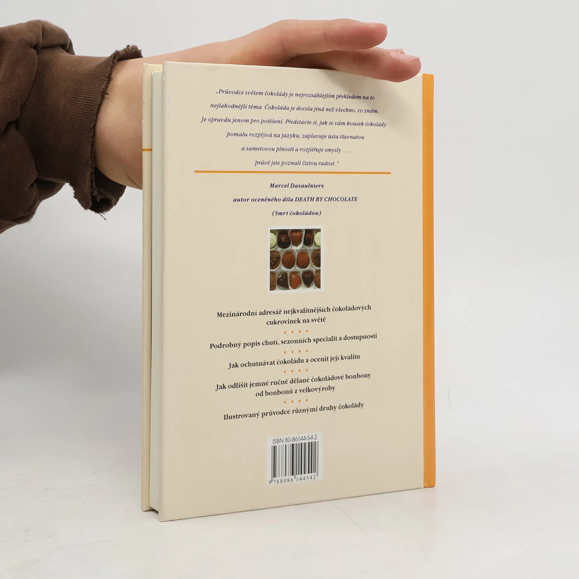 Průvodce znalce světem nejjemnějších čokoládových cukrovinek. "Průvodce světem čokolády je nejrozsáhlejším přehledem na to nejlahodnější téma. Čokoláda je docela jiná než všechno, co znám. Je opravdu jenom pro potěšení. Představte si, jak se vám kousek čokolády pomalu rozplývá na jazyku, zaplavuje ústa šťavnatou a sametovou plností a rozjitřuje smysly..., právě jste poznali čistou radost." Marcel Dasaulniers, autor Death by chocolate (Smrt čokoládou)