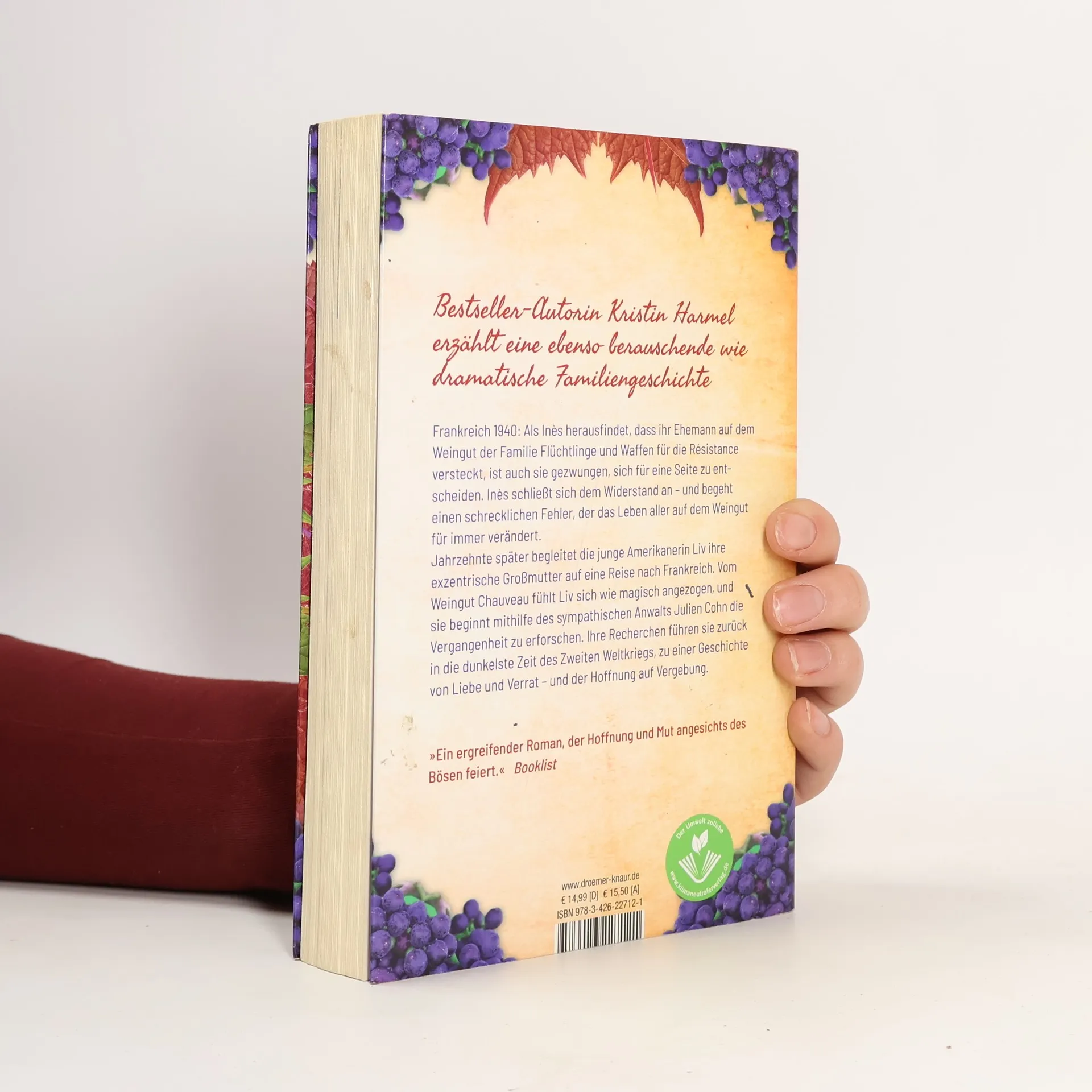 Eine grausame Zeit, ein schrecklicher Fehler und die Hoffnung auf Vergebung: Die Geschichte spielt in Frankreich während des Zweiten Weltkriegs. 1940 entdeckt Inés, dass ihr Ehemann auf dem Familienweingut Flüchtlinge und Waffen für die Résistance versteckt. Sie entscheidet sich, dem Widerstand beizutreten, begeht jedoch einen folgenschweren Fehler, der das Leben aller auf dem Weingut für immer verändert. Jahrzehnte später reist die junge Amerikanerin Liv mit ihrer exzentrischen Großmutter nach Frankreich. Sie fühlt sich magisch zum Weingut Chauveau hingezogen und spürt, dass ihre Großmutter einen besonderen Grund für die Reise hat. Unterstützt von dem sympathischen Anwalt Julien Cohn beginnt Liv, die Geschichte des Weinguts zu erforschen. Ihre Nachforschungen führen sie zurück in die dunkelsten Zeiten des Krieges, in eine Erzählung von Liebe und Verrat sowie der Hoffnung auf Vergebung. Diese tragische und wunderschöne Familien- und Liebesgeschichte verbindet sich nahtlos mit den Themen von Harmels vorherigem Erfolg und wird alle begeistern, die große historische Romane über das 20. Jahrhundert schätzen.