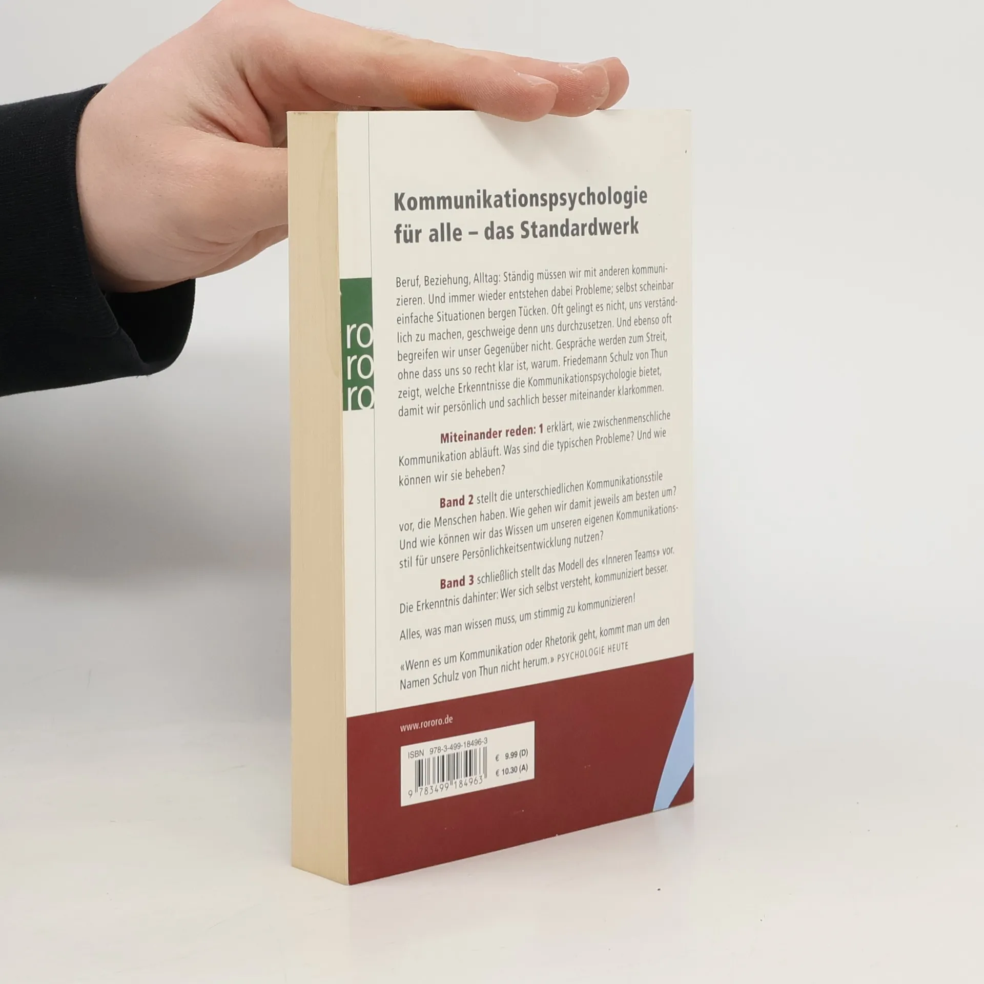 Kommunikationspsychologie für alle – das StandardwerkBeruf, Beziehung, Alltag: Ständig müssen wir mit anderen kommuni-zieren. Und immer wieder entstehen dabei Probleme; selbst scheinbar einfache Situationen bergen Tücken. Oft gelingt es nicht, uns verständlich zu machen, geschweige denn uns durchzusetzen. Und ebenso oft begreifen wir unser Gegenüber nicht. Gespräche werden zum Streit, ohne dass uns so recht klar ist, warum. Friedemann Schulz von Thun zeigt, welche Erkenntnisse die Kommunikationspsychologie bietet, damit wir persönlich und sachlich besser miteinander klarkommen.Miteinander reden: 1 erklärt, wie zwischenmenschlicheKommunikation abläuft. Was sind die typischen Probleme? Und wie können wir sie beheben?Band 2 stellt die unterschiedlichen Kommunikationsstile vor, die Menschen haben. Wie gehen wir damit jeweils am besten um? Und wie können wir das Wissen um unseren eigenen Kommunikationsstil für unsere Persönlichkeitsentwicklung nutzen? Band 3 schließlich stellt das Modell des «Inneren Teams» vor. Die Erkenntnis dahinter: Wer sich selbst versteht, kommuniziert besser. Alles, was man wissen muss, um stimmig zu kommunizieren!«Wenn es um Kommunikation oder Rhetorik geht, kommt man um den Namen Schulz von Thun nicht herum.» PSYCHOLOGIE HEUTE