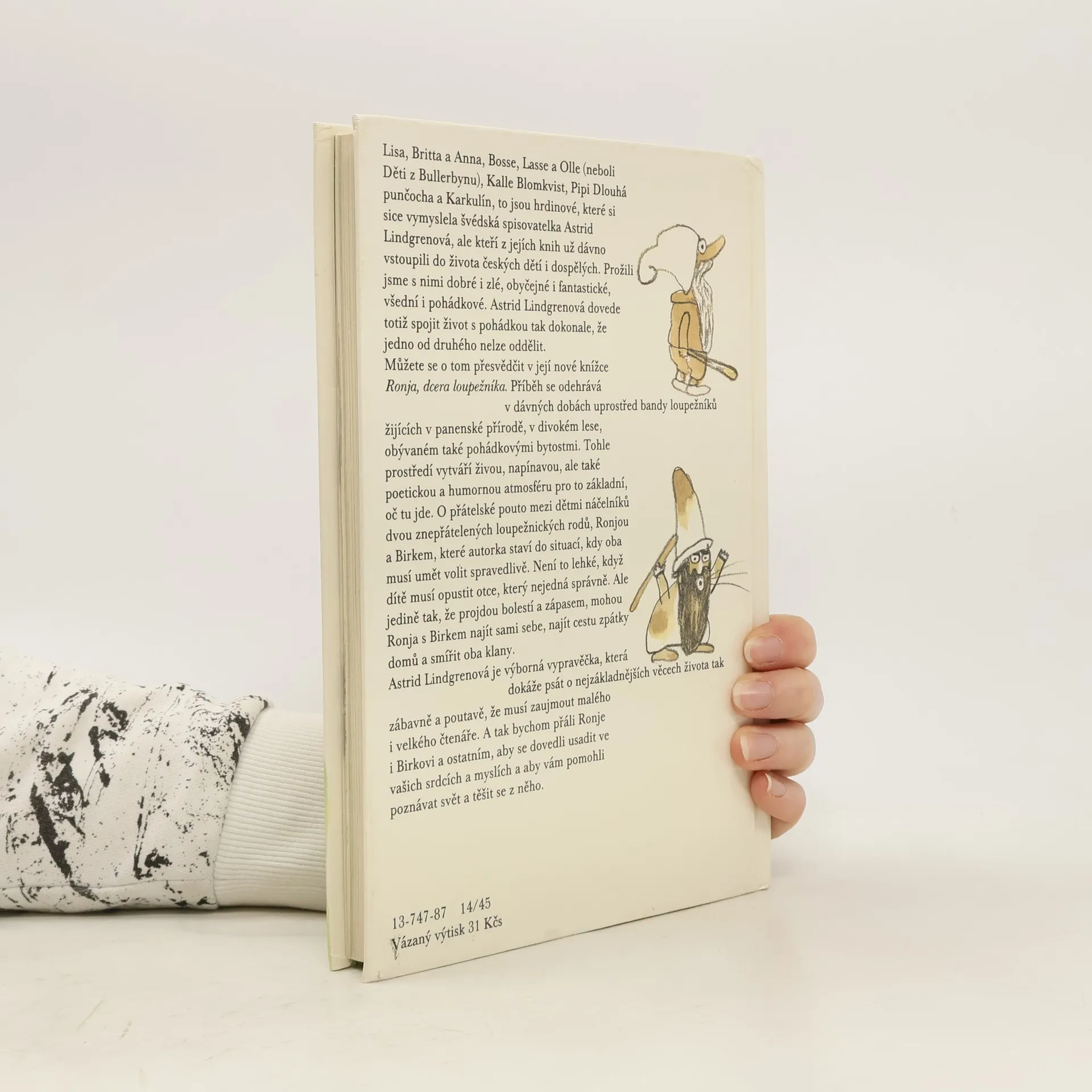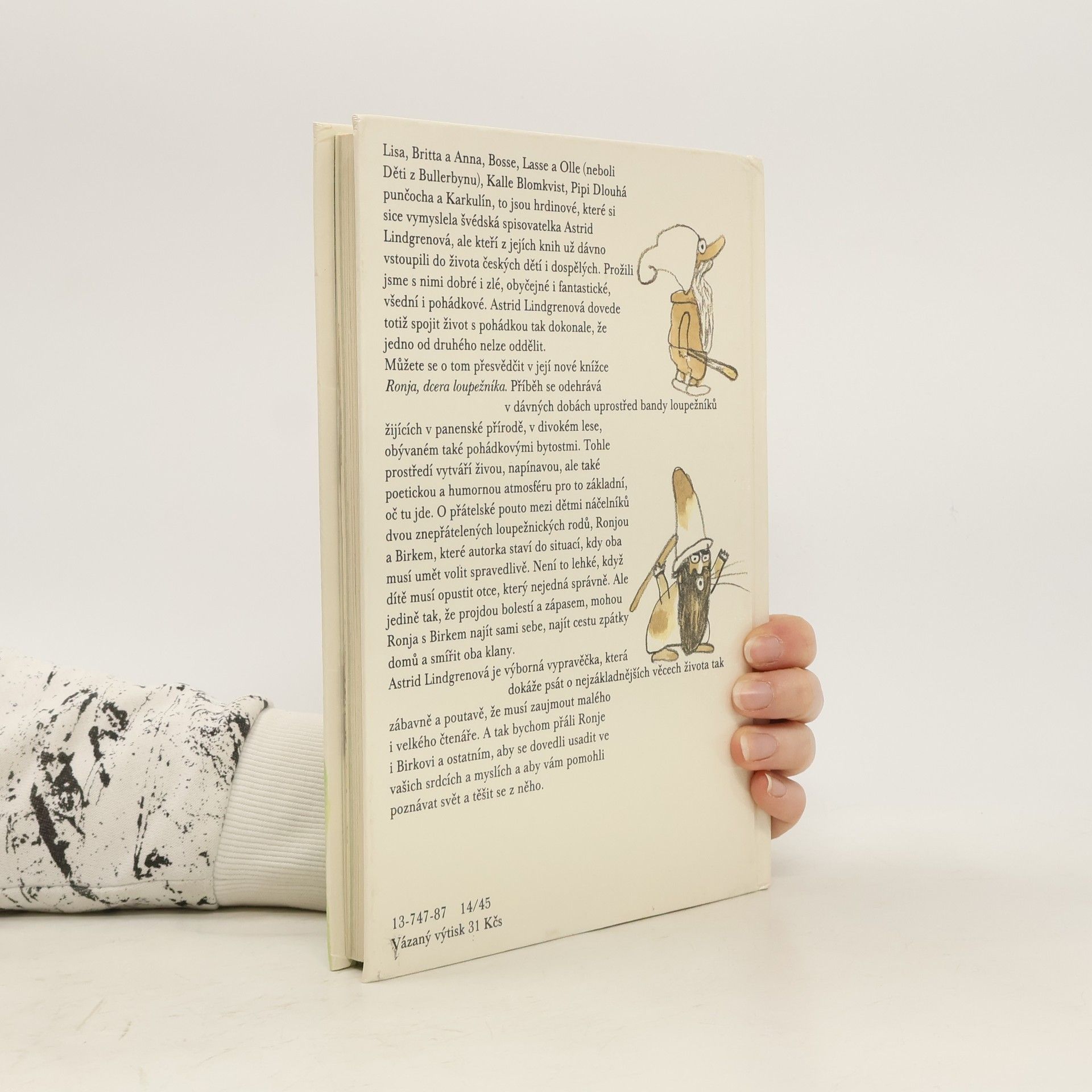 Ronja se narodila za bouřlivé noci, která byla tak děsuplná, že napůl rozťala prastarý hrad, v němž vládl její otec bandě loupežníků. Odtrženou část hradu ihned obsadil na smrt znepřátelený rod lupiče Borky. A co čert nechtěl, Ronja našla svého nejlepšího kamaráda právě v synovi Borky, Birkovi. Co všechno nebezpečného i hezkého z toho vzešlo, se dozvíte v tomto příběhu, jenž se odehrává v divokém lese a lukách se skřítky, větrnicemi, smíchem i nadějí, že se Ronje i Birkovi snad podaří smířit odedávna znesvářené klany. 13-747-87