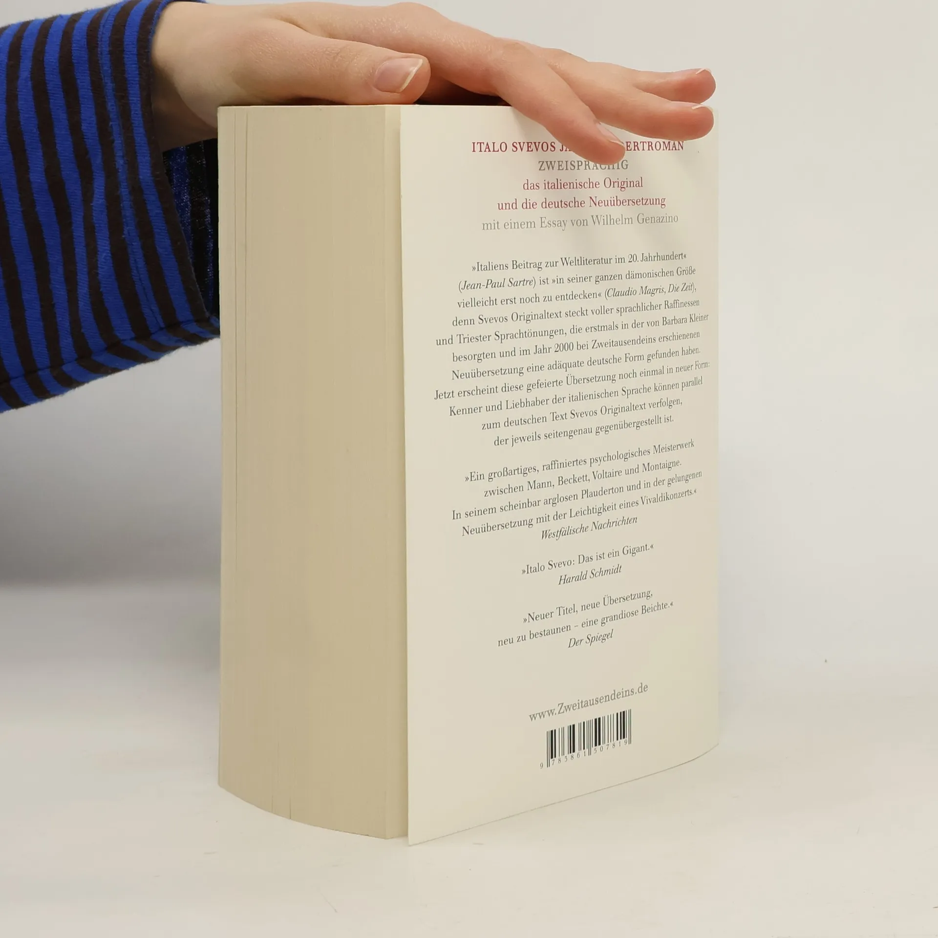 Erstmals zweisprachig: Italo Svevos Jahrhundertroman Zenos Gewissen. Das italienische Original und die Neuübersetzung von Barbara Kleiner. Mit einem Essay von Wilhelm Genazino. Hätte Italo Svevo nicht den Entschluss gefasst, seine Englischkenntnisse zu verbessern, und wäre er bei der Umsetzung dieses Planes nicht zufällig auf James Joyce getroffen, würden heute vielleicht nur Spezialisten für italienische Regionalliteratur seinen Namen kennen. Doch es kam anders: „Heute lässt die italienische Literaturgeschichte mit ihm die Moderne beginnen“ (Hermann Kurzke, FAZ). Svevos Hauptwerk, der Roman „Zenos Gewissen“, gilt längst als „eines der größten Bücher des Jahrhunderts, und nicht nur des Jahrhunderts, das trotz seiner inzwischen weltweiten Geltung in seiner ganzen dämonischen Größe vielleicht erst noch zu entdecken ist“ (Claudio Magris, Die Zeit). Svevos Originaltext steckt voller sprachlicher Raffinessen und Triester Sprachtönungen, die erstmals in der von Barbara Kleiner besorgten und bei Zweitausendeins erschienenen Neuübersetzung eine adäquate deutsche Form gefunden hatten. Nicht nur Der Spiegel war beeindruckt: „Neuer Titel, neue Übersetzung … neu zu bestaunen - eine grandiose Beichte.“ „Nun ist dieses Meisterwerk der Weltliteratur in einer präzisen, einfühlsamen Übersetzung erschienen, die dem Original gerecht wird … Die unvollständige Übersetzung von 1929 ist vom Tisch“ (Marion Lühe, Rheinischer Merkur). Jetzt erscheint die gefeierte Übersetzung von Barbara Kleiner noch einmal in neuer Form: Kenner und Liebhaber der italienischen Sprache können parallel zur deutschen Version Svevos Originaltext verfolgen, der jeweils seitengenau gegenüber gestellt ist. Mit einem Essay von Wilhelm Genazino („Eine bessere Einführung kann man dem deutschen Svevo-Entdecker kaum wünschen“, Frankfurter Rundschau).