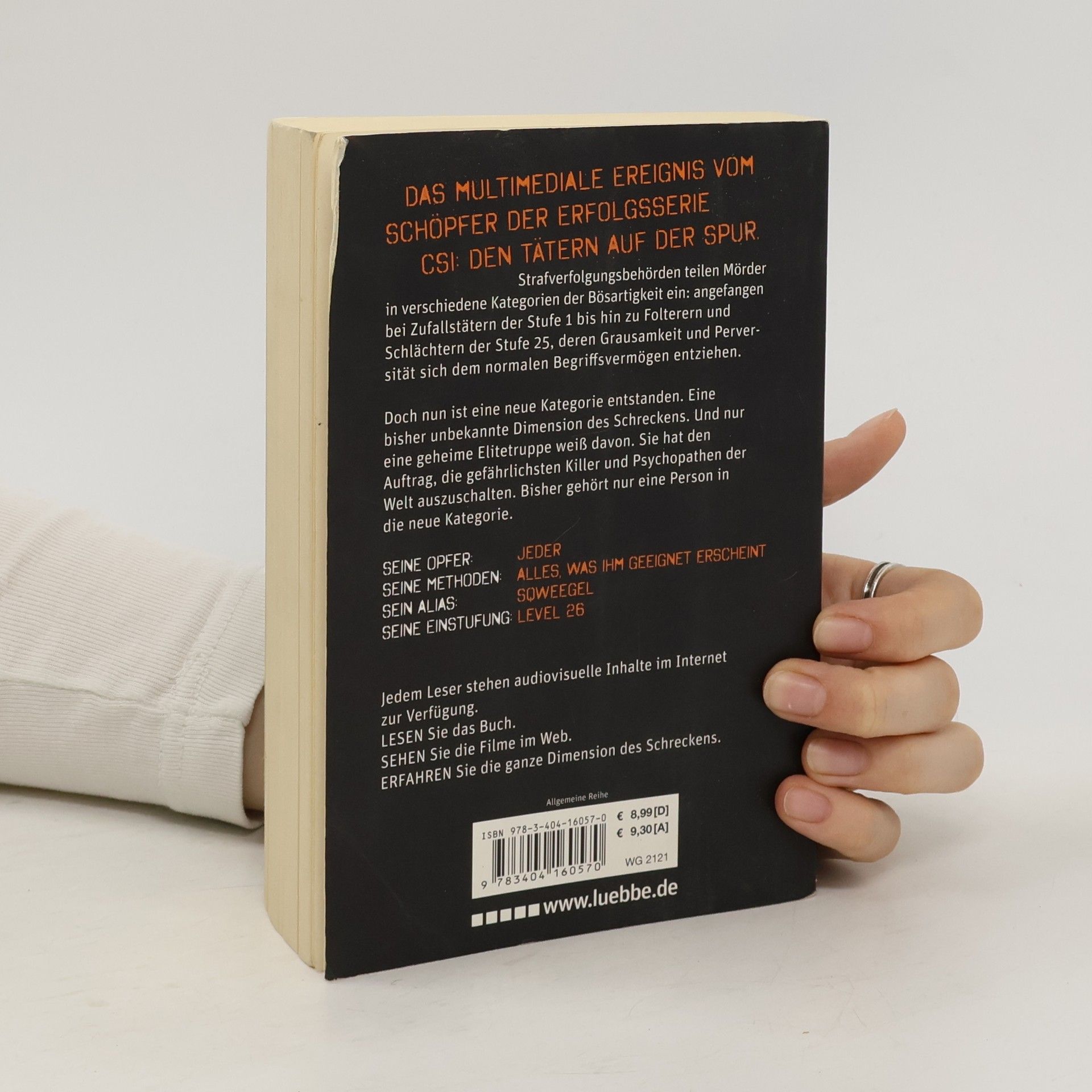 Strafverfolgungsbehörden teilen Mörder in verschiedene Kategorien der Bösartigkeit ein: angefangen bei Zufallstätern der Stufe 1 bis hin zu Folterern und Schlächtern der Stufe 25, deren Grausamkeit und Perversität sich dem normalen Begriffsvermögen entziehen. Doch nun ist eine neue Kategorie entstanden. Eine bisher unbekannte Dimension des Schreckens. Und nur eine geheime Elitetruppe weiß davon. Sie hat den Auftrag, die gefährlichsten Killer und Psychopathen der Welt auszuschalten. Bisher gehört nur eine Person in die neue Kategorie. Seine Opfer: Jeder Seine Methoden: Alles, was ihm geeignet erscheint Sein Alias: Sqweegel Seine Einstufung: Level 26 Jedem Leser stehen audiovisuelle Inhalte im Internet zur Verfügung. LESEN Sie das Buch. SEHEN Sie die Filme im Web. ERFAHREN Sie die ganze Dimension des Schreckens.