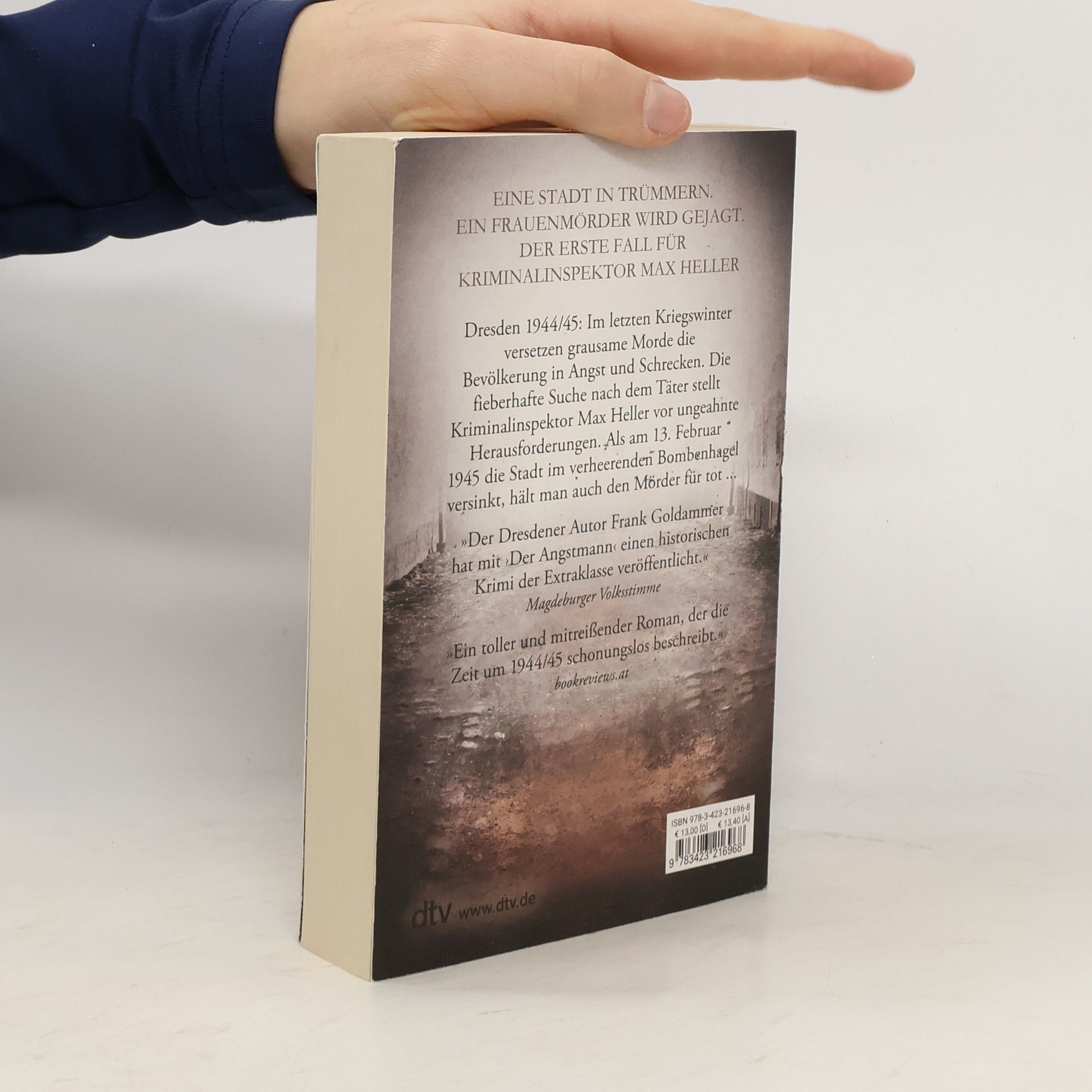 Ein bedingungsloser Appell an Menschlichkeit und Gerechtigkeit. Dresden, November 1944: Die Bevölkerung leidet unter den anhaltenden Kriegszuständen und den täglichen Entbehrungen. Flüchtlingsströme drängen in die Stadt. Bombenalarme gehören zum Alltag. Da wird Kriminalinspektor Max Heller zu einer grausam zugerichteten Frauenleiche geholt. Schnell geht das Gerücht um: Das war der Angstmann, der nachts durch die Ruinen schleicht. Heller gibt nichts auf das Gerede. Inmitten der Wirren des letzten Kriegswinters macht er sich auf die Suche nach einem brutalen Frauenmörder. Nicht nur sein linientreuer Vorgesetzter Rudolf Klepp legt Heller dabei Hindernisse in den Weg. Als im Februar 1945 die Stadt in einem beispiellosen Bombenhagel dem Erdboden gleich gemacht wird, hält man auch den Mörder für tot. Doch der Angstmann kehrt zurück...