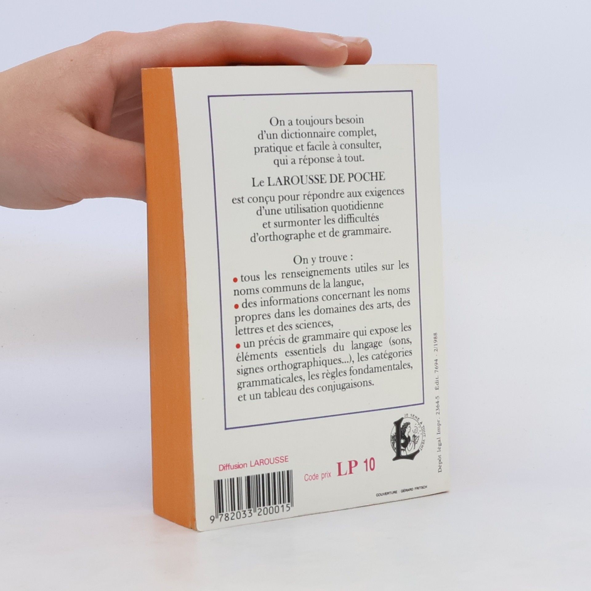 On a toujours besoin d'un dictionnaire complet, pratique et facile à consulter, qui a réponse à tout. LE LAROUSSE DE POCHE est conçu pour répondre aux exigences d'une utilisation quotidienne et surmonter les difficultés d'orthographe et de grammaire. On y trouve : - tous les renseignements utiles sur les noms communs de la langue, - des informations concernant les noms propres dans les domaines des arts, des lettres et des sciences, - un précis de grammaire qui expose les éléments essentiels du langage (sons, signes orthographiques...), les catégories grammaticales, les règles fondamentales, et un tableau des conjugaisons.