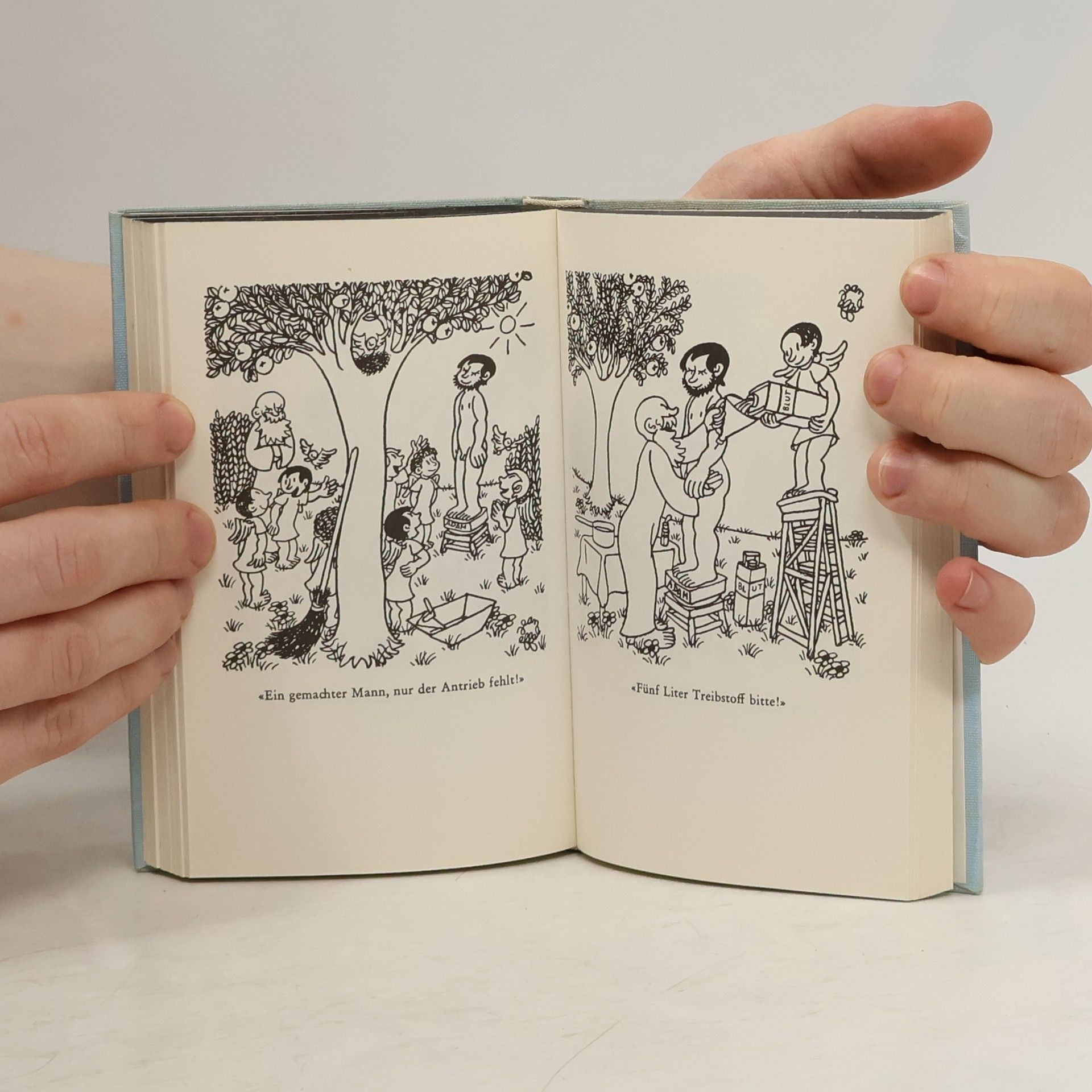Hier faßt Jean Effel seine bekannten "Paradiesischen Bildbücher" zusammen. Wer sie noch nicht kannte, hat hier das Vergnügen der ersten Begegnung. Wer sie kennt, genießt sie in handlichem Format wieder und hat etwas Hübsches zum Verschenken. Die Genesis rollt nunmehr als ein geschlossenes Unternehmen ab: erst wird von einem sehr lieben "Liebes Gott" die Welt geschaffen, dann Adam, der dumpfe Edenkloß, und schließlich, damit Adam nicht allein sei, seine hübsche Gefährtin Eva. Das Ganze ist, zeichnerisch aufs liebenswürdigste erzählt, der Anfang des Weltenlaufs. In einem weiteren Bildband "Adam und Eva im Paradies" begleitet Effels Zeichenstift das Leben im Garten Eden und den Sündenfall. Eine charmante Parodie auf unsere älteste unbewältigte Vergangenheit