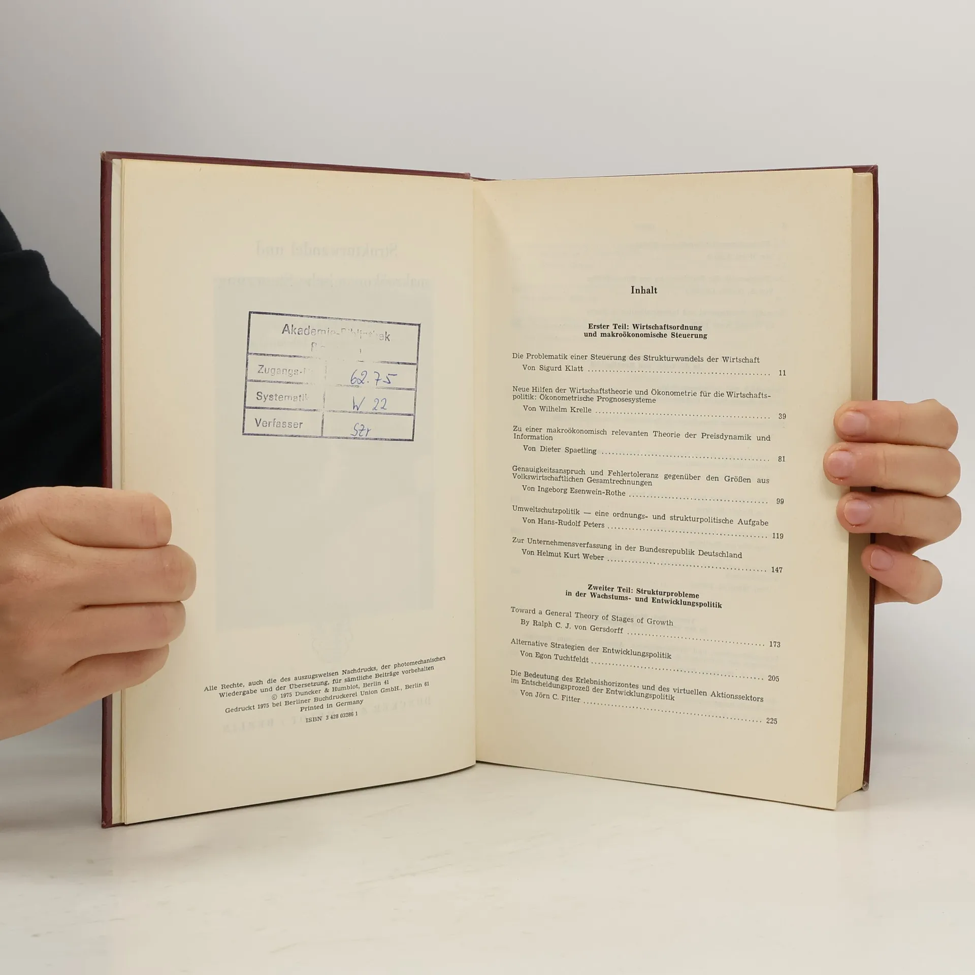 Inhaltsverzeichnis: S. Klatt diskutiert die Herausforderungen bei der Steuerung des Strukturwandels der Wirtschaft. W. Krelle beleuchtet die neuen Hilfen der Wirtschaftstheorie und Ökonometrie für die Wirtschaftspolitik, insbesondere durch ökonometrische Prognosesysteme. D. Spaetling entwickelt eine makroökonomisch relevante Theorie der Preisdynamik und Information. I. Esenwein-Rothe thematisiert den Genauigkeitsanspruch und die Fehlertoleranz in Bezug auf volkswirtschaftliche Gesamtrechnungen. H.-R. Peters betrachtet Umweltschutzpolitik als ordnungs- und strukturpolitische Aufgabe. H. K. Weber analysiert die Unternehmensverfassung in Deutschland. R. C. J. von Gersdorff strebt eine allgemeine Theorie der Wachstumsphasen an, während E. Tuchtfeldt alternative Strategien der Entwicklungspolitik präsentiert. J. C. Fitter hebt die Bedeutung des Erlebnishorizontes im Entscheidungsprozess der Entwicklungspolitik hervor. H. Albach befasst sich mit der Finanzierung beruflicher Bildung. A. Ghanie Ghaussy thematisiert die Stabilisierung der Rohstofferlöse. Y. Hoon Paik untersucht die wirtschaftliche Entwicklung und Industrialisierung in Korea. J. Siebke und M. Willms analysieren Geldpolitik und Vermögenseffekte. D. Kath erörtert die theoretischen Grundlagen geldpolitischer Steuerungskonzepte. O. Issing äußert sich zur Unabhängigkeit der Bundesbank und zur geplanten Novellierung des Bundesbankgesetzes. R. Stucken reflektiert über die fünf