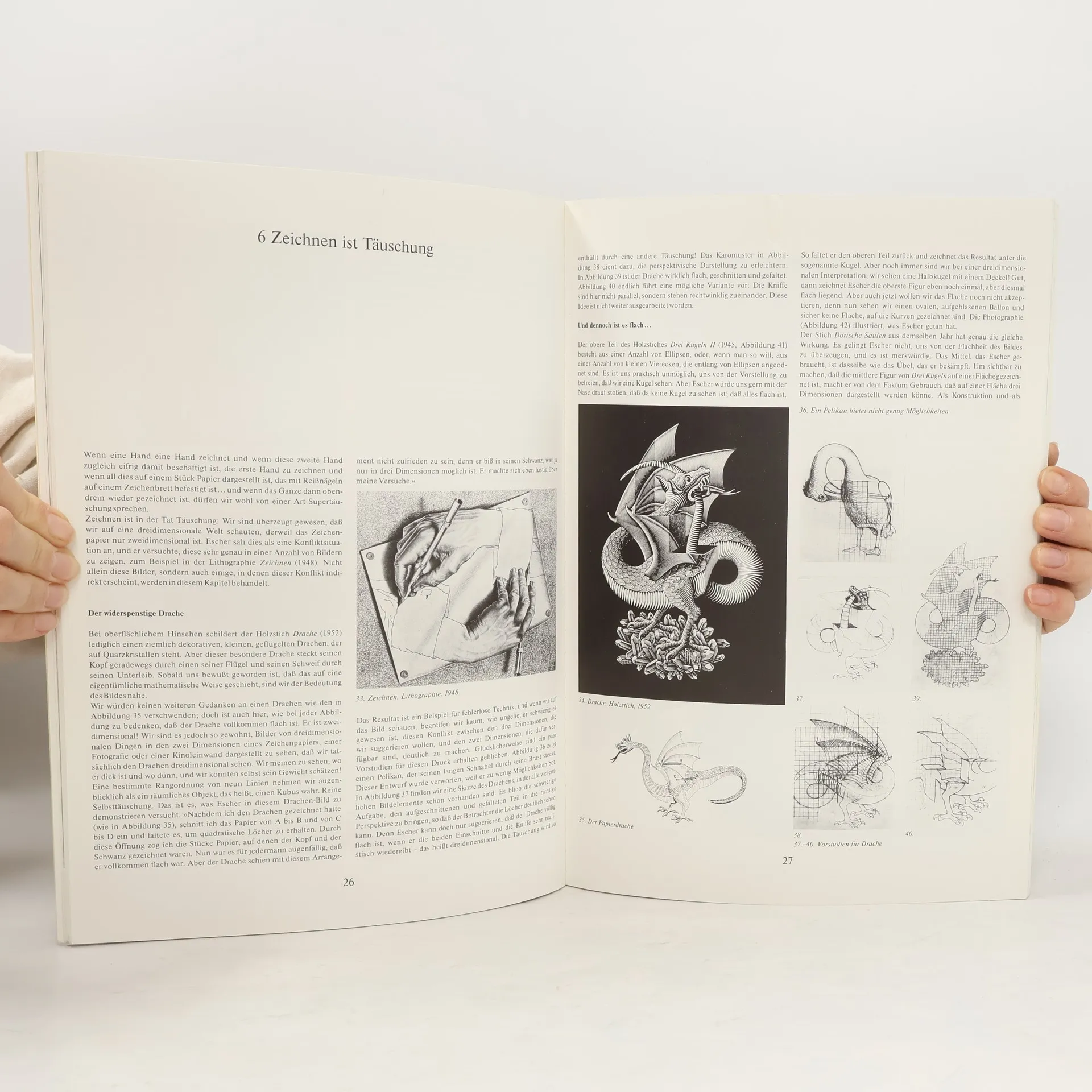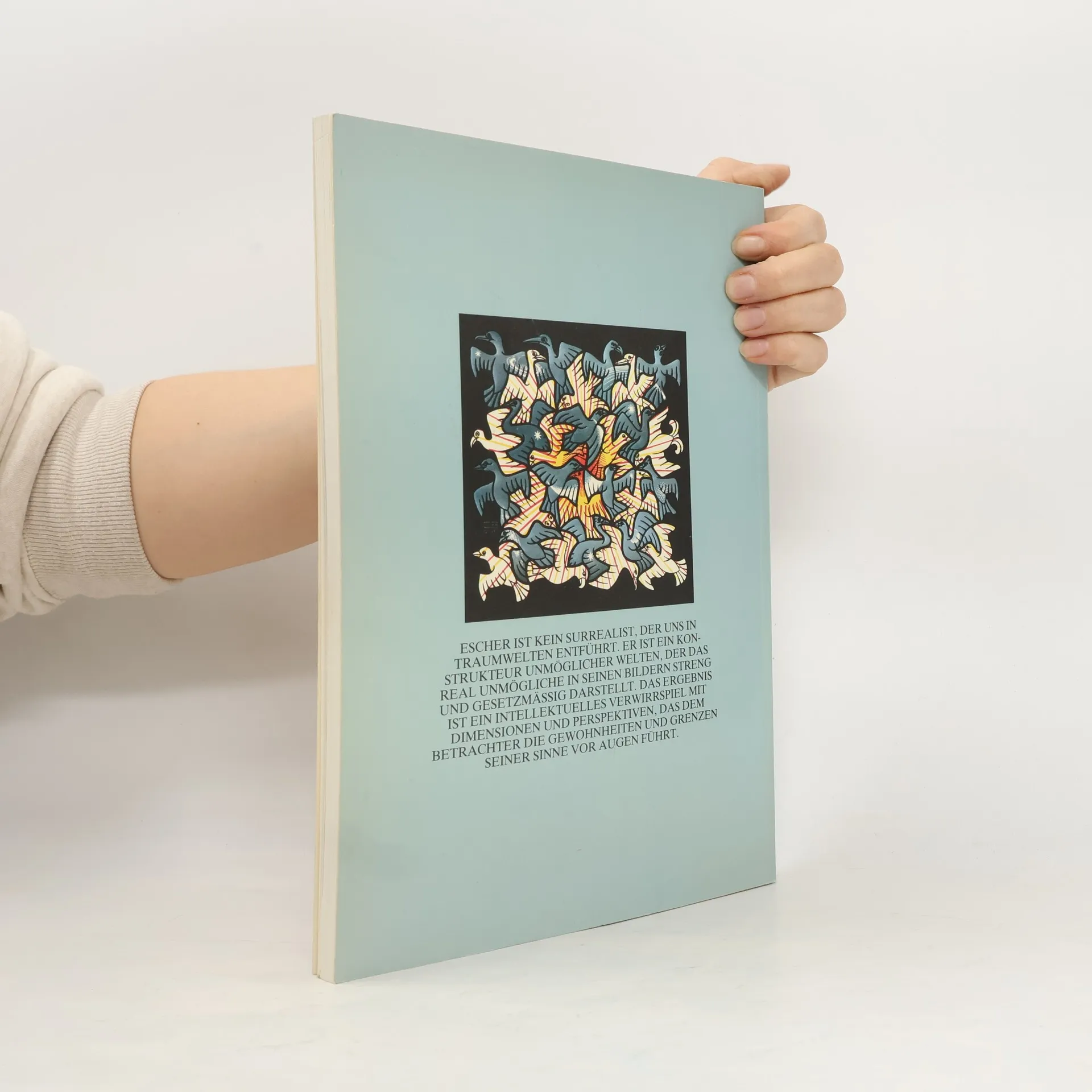 Escher ist kein Surrealist, der uns in Traumwelten entführt. Er ist ein Konstrukteur unmöglicher Welten, der das real Unmögliche in seinen Bildern streng und gesetzmäßig darstellt. Das Ergebnis ist ein intellektuelles Verwirrspiel mit Dimensionen und Perspektiven, das dem Betrachter die Gewohnheiten und Grenzen seiner Sinne vor Augen führt.
