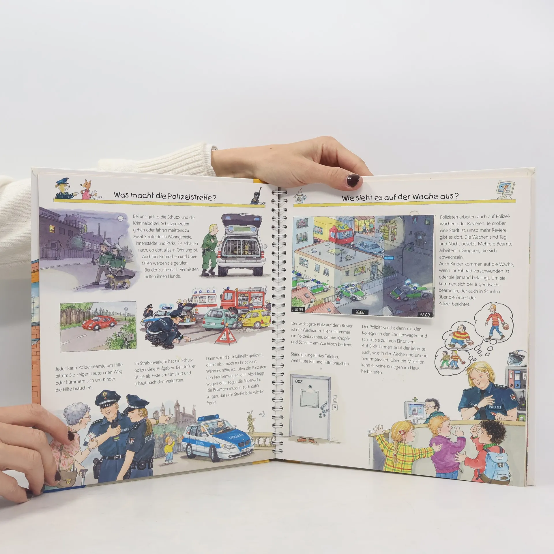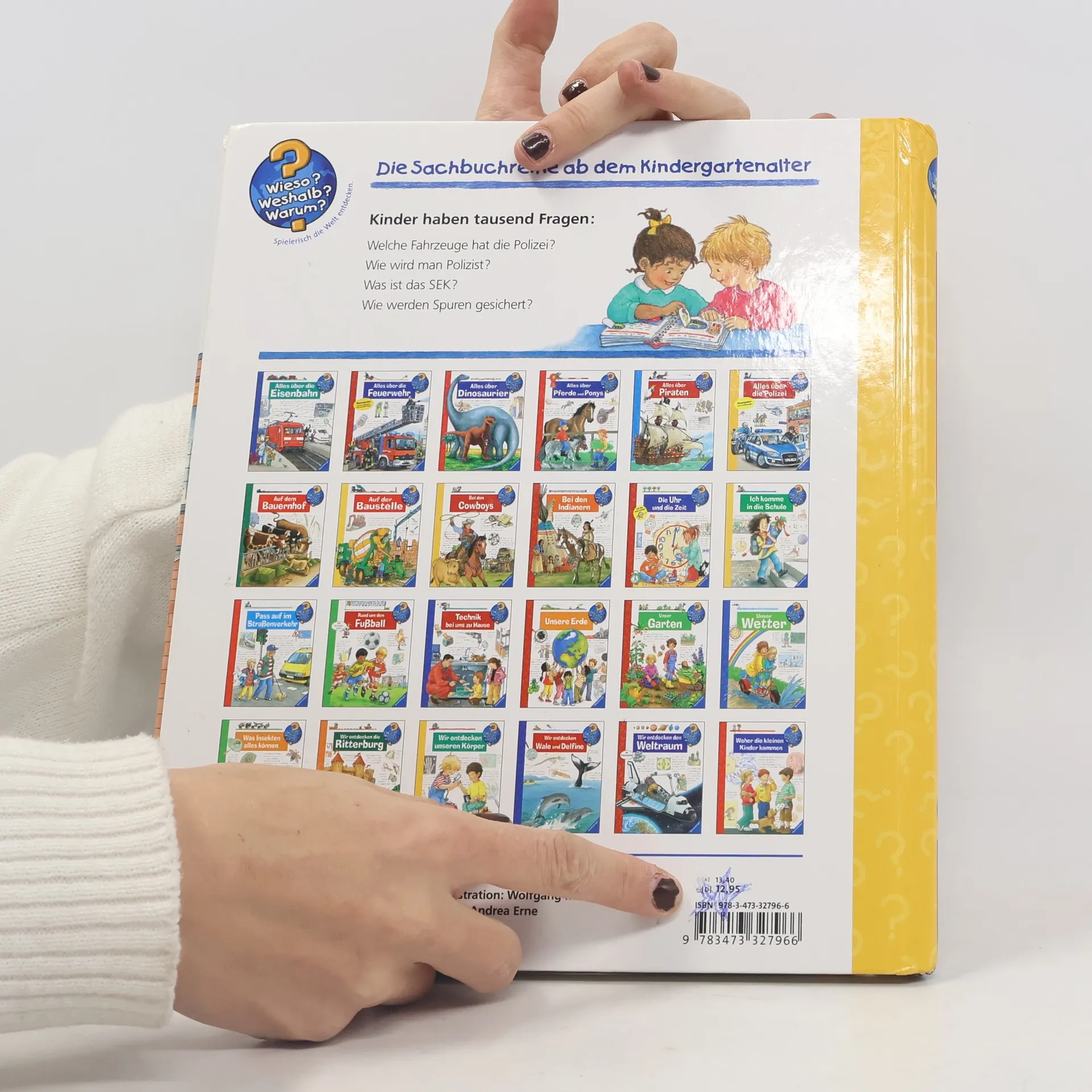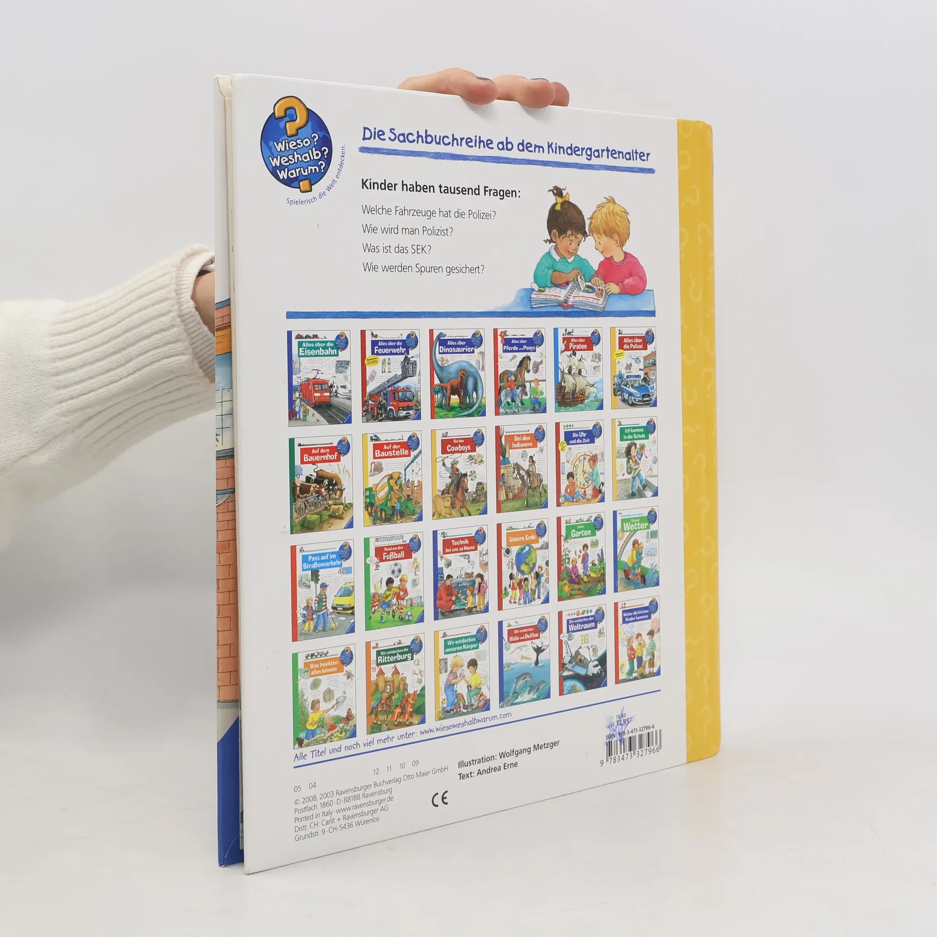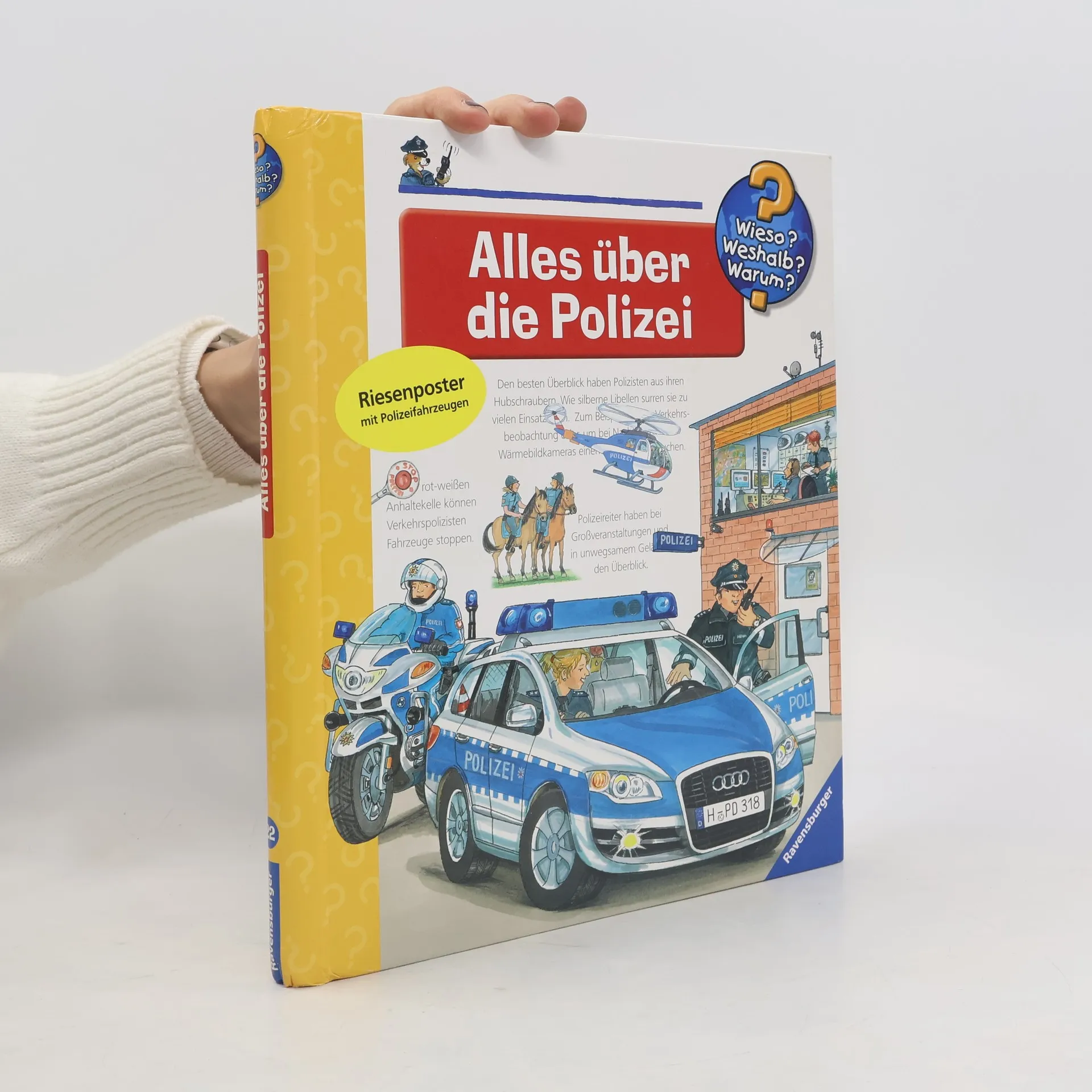 Tatütata, die Polizei ist da! Ob Ladendiebstahl, Einbruch oder Verkehrsunfall – die Frauen und Männer in Blau sind stets einsatzbereit und schnell vor Ort. Das Buch stellt ihre unterschiedlichen Aufgabengebiete, die Ausrüstung und Polizeifahrzeuge vor. Die Kinder erfahren, wie man Polizist wird und was Polizeihunde alles können. Aber auch die Kriminalpolizei, Spurensicherung und verschiedene Spezialeinheiten werden unter die Lupe genommen. Wieso? Weshalb? Warum? Die Sachbuchreihe für Kinder von 4–7 Jahren Jeden Tag entdecken Kinder etwas Neues – da kommen viele Fragen auf. Warum sind die Dinosaurier ausgestorben? Wo ist die Sonne in der Nacht? Wozu brauchen wir das Blut? Die beliebte Sachbuchreihe Wieso? Weshalb? Warum? gibt Kindern Antworten auf Augenhöhe. Dabei werden die unterschiedlichsten Themen aus der Alltags- und Interessenswelt der Kinder altersgerecht und mit viel Liebe zum Detail unter die Lupe genommen. Detailreiche Bilder, verständliche Sachtexte und überraschende Klappen, die Bewegungen oder Abläufe veranschaulichen und hinter die Dinge blicken lassen, ermöglichen Kindern, sich ihre Themen selbst zu erschließen. Der Spaß am eigenhändigen Entdecken, die liebevolle Umsetzung und die qualitativ hochwertige Ausstattung garantieren langanhaltende Freude an jedem einzelnen Buch.