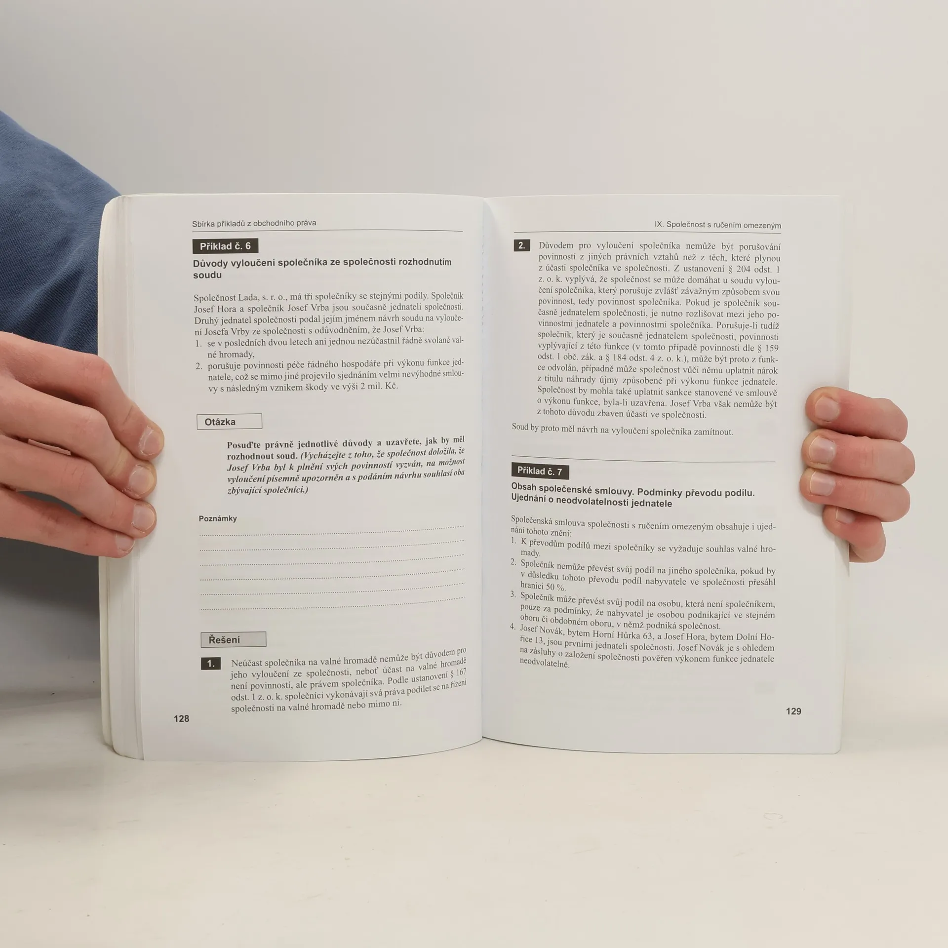 Přepracované, 4. vydání učebnice obsahuje příklady z oboru obchodního práva, jež jsou navíc všechny opatřeny i řešením. Publikace je určena především studentům k procvičování látky, s níž se seznamují na přednáškách, seminářích i studiem učebních textů či s níž se setkávají v praxi, a má pomoci k pochopení širších souvislostí jednotlivých příkladů. Odpovědi na některé položené otázky jsou proto rozpracovány do větší šíře, než jaká je požadována pro řešení příkladů při klauzurních pracích. Příklady mají vést studenty především k užití logiky, systematického i historického výkladu i přemýšlení o účelu právní normy. Proto autoři této učebnice kladou důraz na právní principy, které mají při výkladu a aplikaci konkrétní právní normy a při řešení příkladů nejen interpretační, ale často i subsidiární, případně derogační význam.
