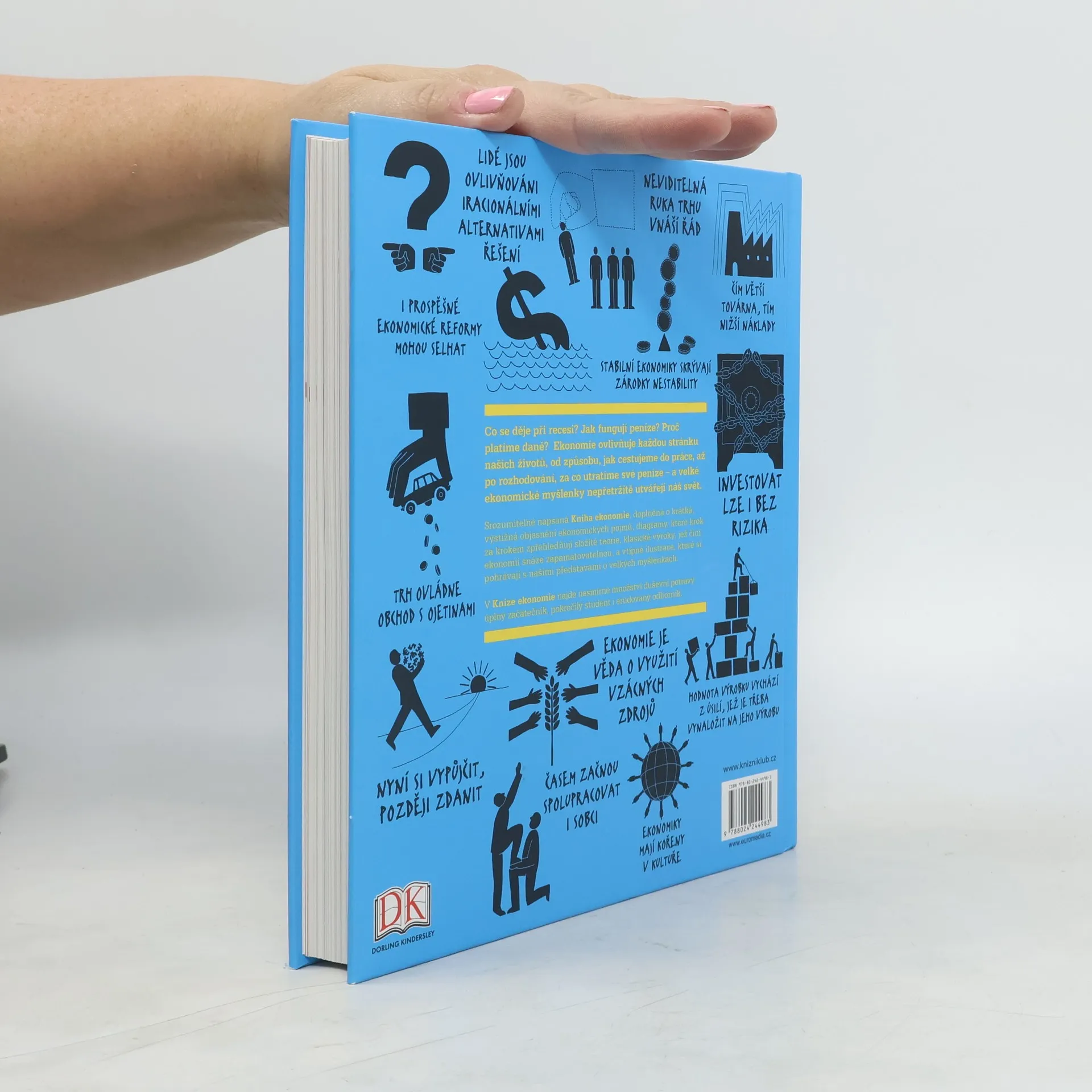 Co se děje při recesi? Jak fungují peníze? Proč platíme daně? Ekonomie ovlivňuje každou stránku našich životů, od způsobu, jak cestujeme do práce, až po rozhodování, za co utratíme své peníze – a velké ekonomické myšlenky nepřetržitě utvářejí náš svět. Srozumitelné napsaná Kniha ekonomie, doplněná o krátká, výstižná objasnění ekonomických pojmů, diagramy, které krok za krokem zpřehledňují složité teorie, klasické výroky, jež činí ekonomii snáze zapamatovatelnou, a vtipné ilustrace, které si pohrávají s našimi představami o velkých myšlenkách.