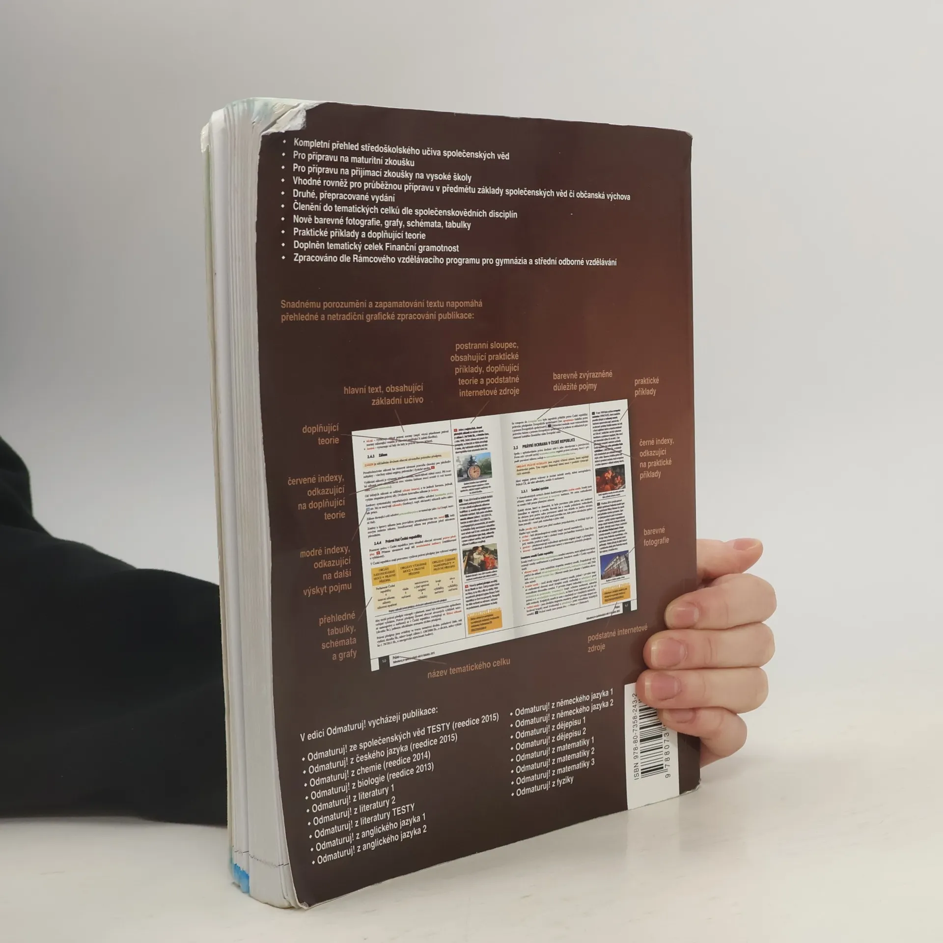 Nakladatelství DIDAKTIS připravuje nové vydání úspěšného titulu Odmaturuj! ze společenských věd z edice Odmaturuj! Edice Odmaturuj! je primárně určena na přípravu k maturitní zkoušce, a to především k maturitní zkoušce v části profilové, taktéž slouží k přípravě na přijímací zkoušky na vysoké školy s humanitním zaměřením. Titul Odmaturuj! ze společenských věd však v novém vydání doporučujeme také pro průběžnou přípravu v předmětu základy společenských věd či občanská výchova na středních školách. I když tituly z edice Odmaturuj! nejsou koncipovány jako učebnice, je do nich zařazeno z hlediska obsahové komplexnosti veškeré středoškolské učivo. Titul je zpracován dle RVP pro gymnázia a RVP pro střední odborné vzdělávání. Nové vydání bude aktualizované podle legislativy účinné k 1. 1. 2015, bude doplněno o nové teoretické poznatky v rámci jednotlivých vědních disciplín a o praktické příklady. Obsah knihy je členěn do následujících tematických celků: Politologie Právo Mezinárodní vztahy Ekonomie Sociologie Psychologie Filozofie Etika Logika a teorie vědy Religionistika Finanční gramotnost Po grafické stránce je důležitou změnou převedení titulu do barevného provedení na bílém podkladu, výklad je doplněn řadou schémat, tabulek a grafů. Nově byl přidán také odkazový aparát v rámci textu a odkazy na podstatné internetové zdroje.