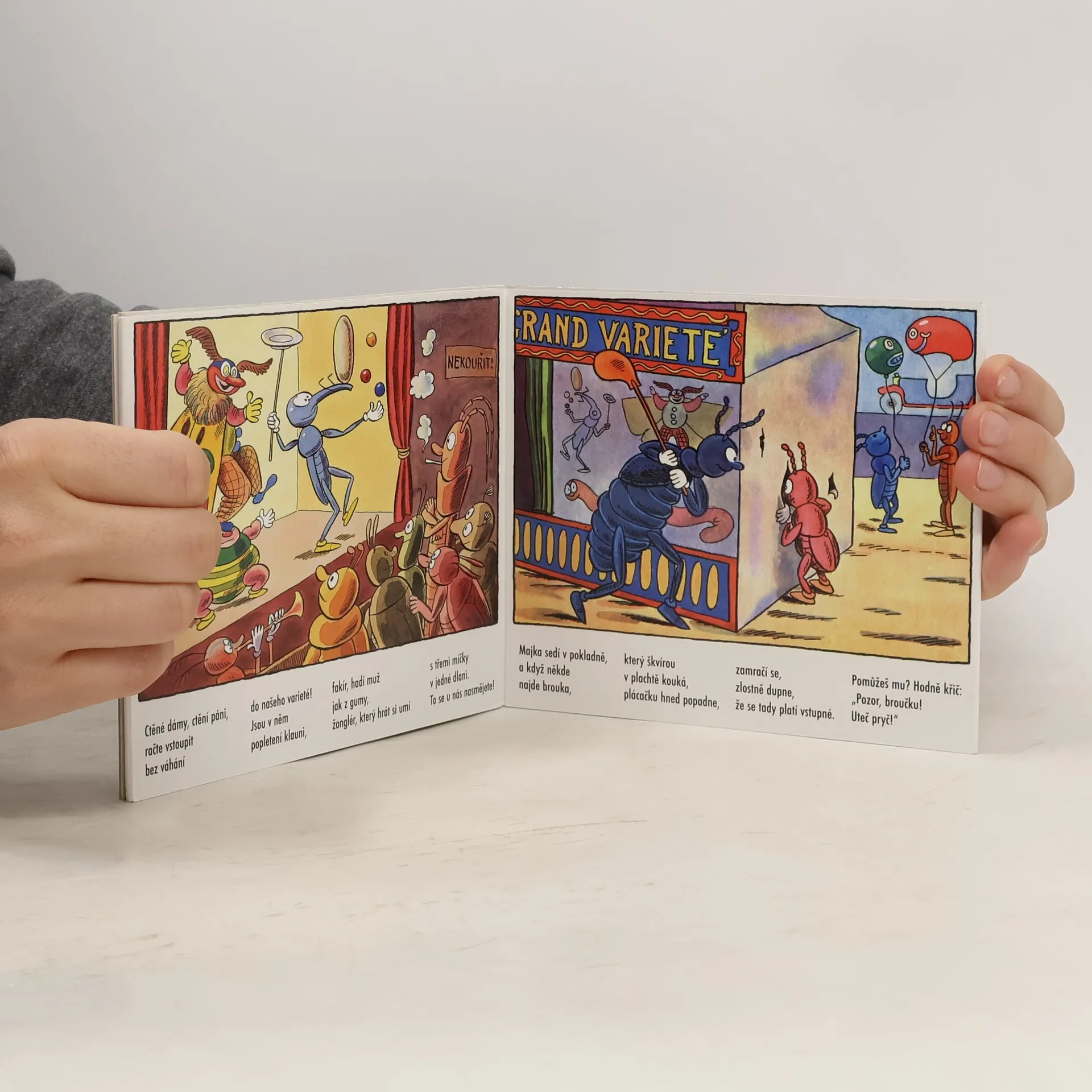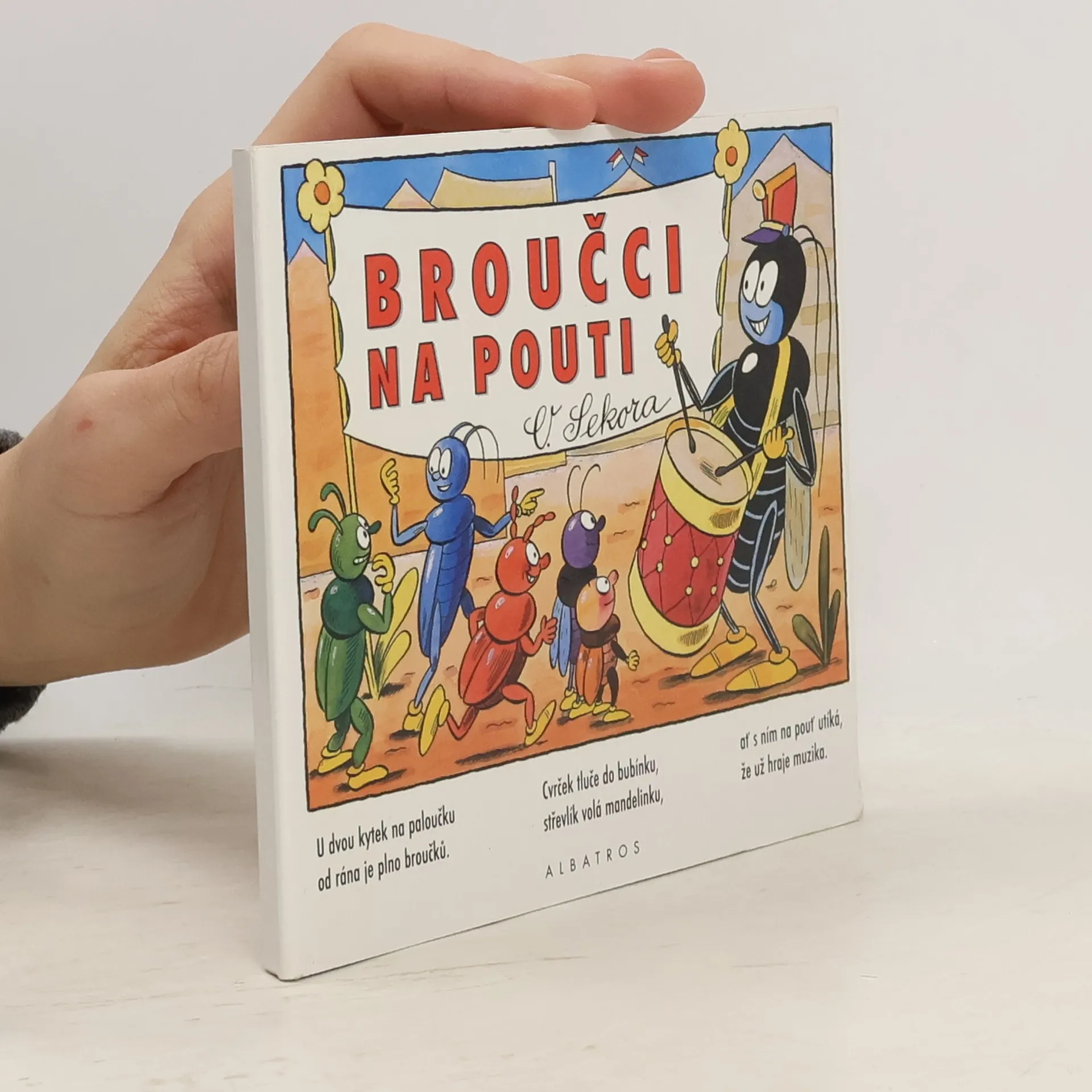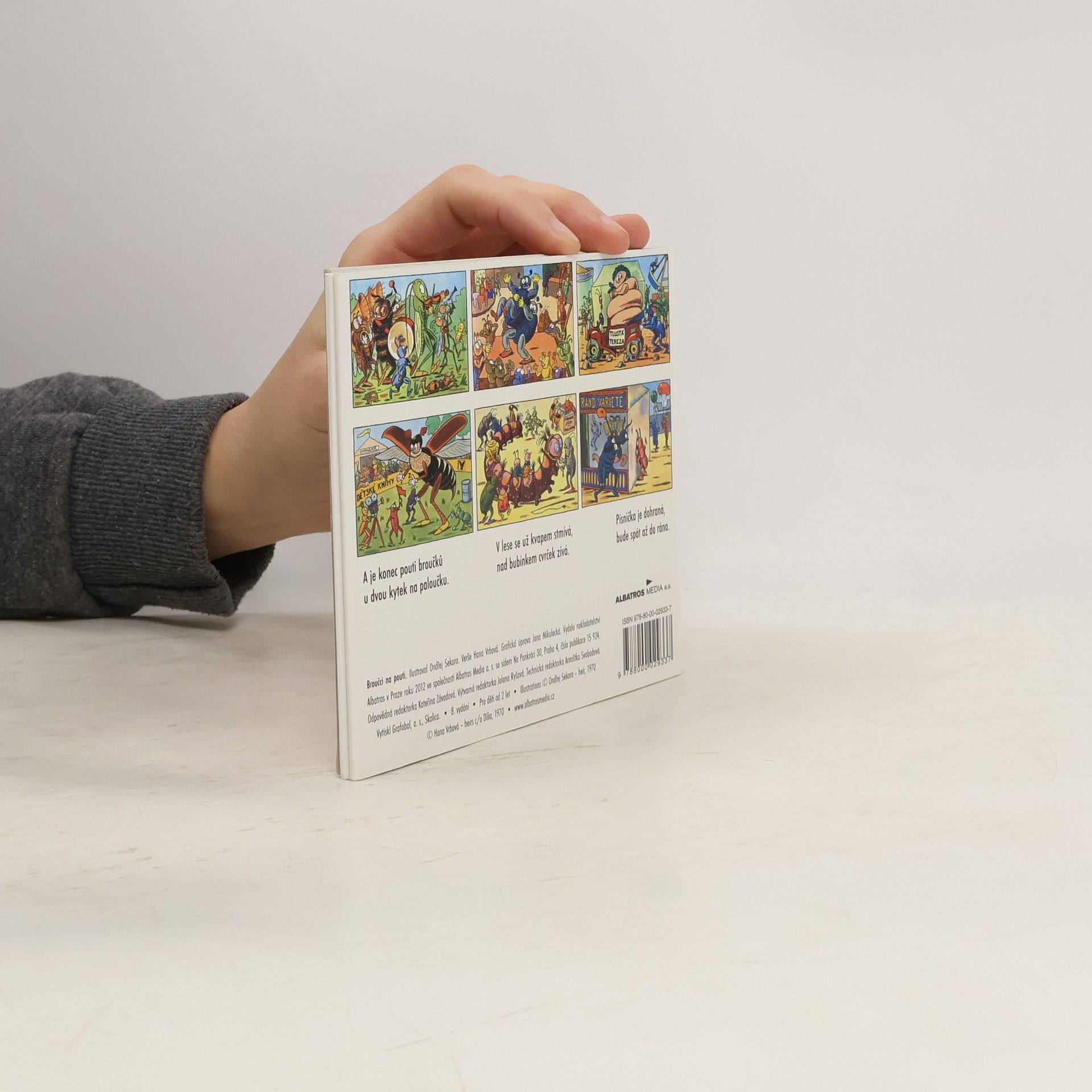 Na broučí pouti se užije spousta legrace! Krásně vypodobnění obyvatelé hmyzího světa navštíví varieté, koupí si něco na zub, svezou se na housence nebo sledují dostihy lučních koníků. Ilustrace doplňují jednoduché rytmické veršíky.