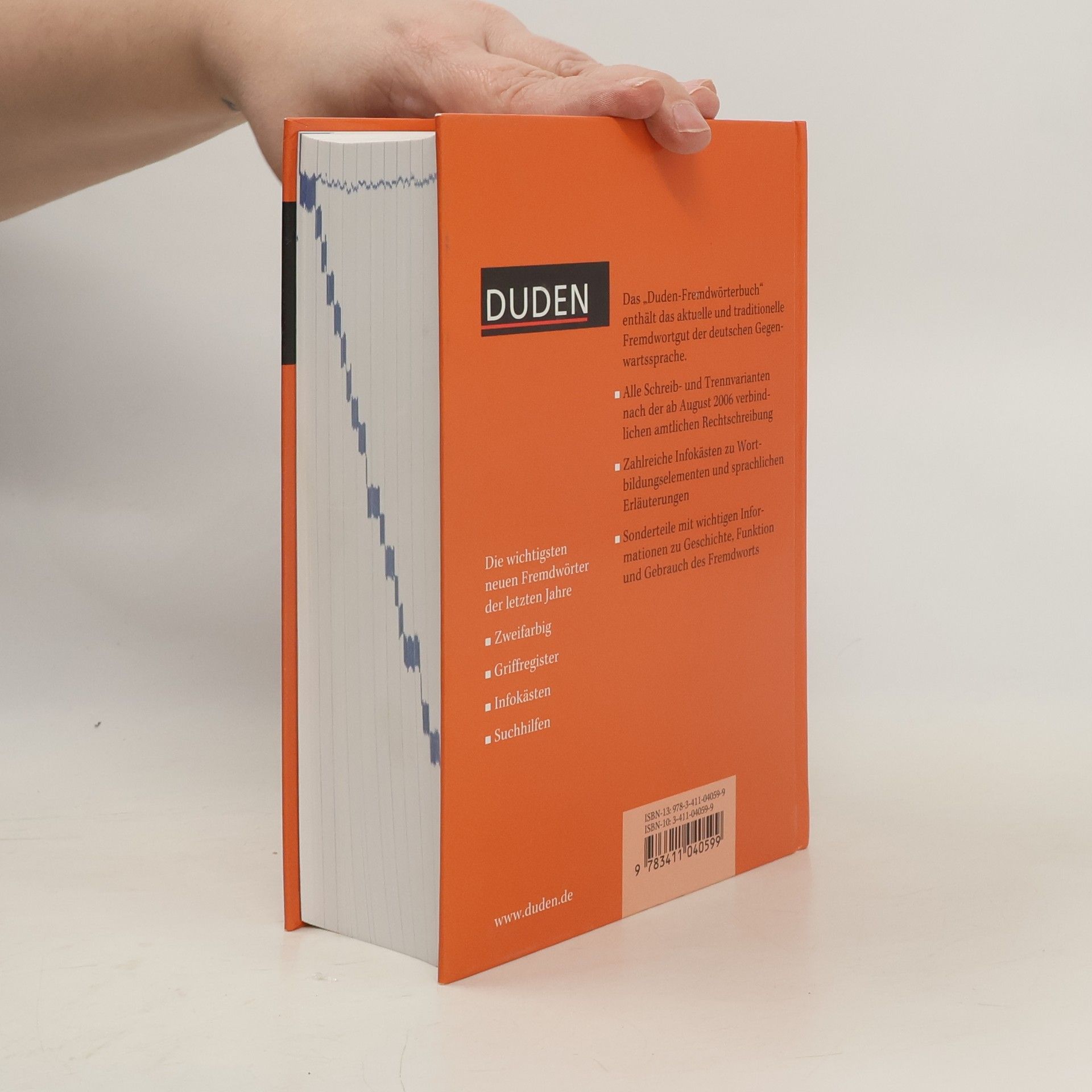 Für jeden, der Fremdwörter in der deutschen Sprache richtig schreiben, genau verstehen und korrekt gebrauchen will. 55.000 aktuelle und traditionelle Fremd- und Fachwörter der deutschen Gegenwartssprache. Mit Suchhilfen für Stichwörter, deren Schreibweise unsicher ist. Auf der Grundlage der seit dem 1.8.2006 verbindlichen amtlichen Rechtschreibregeln.