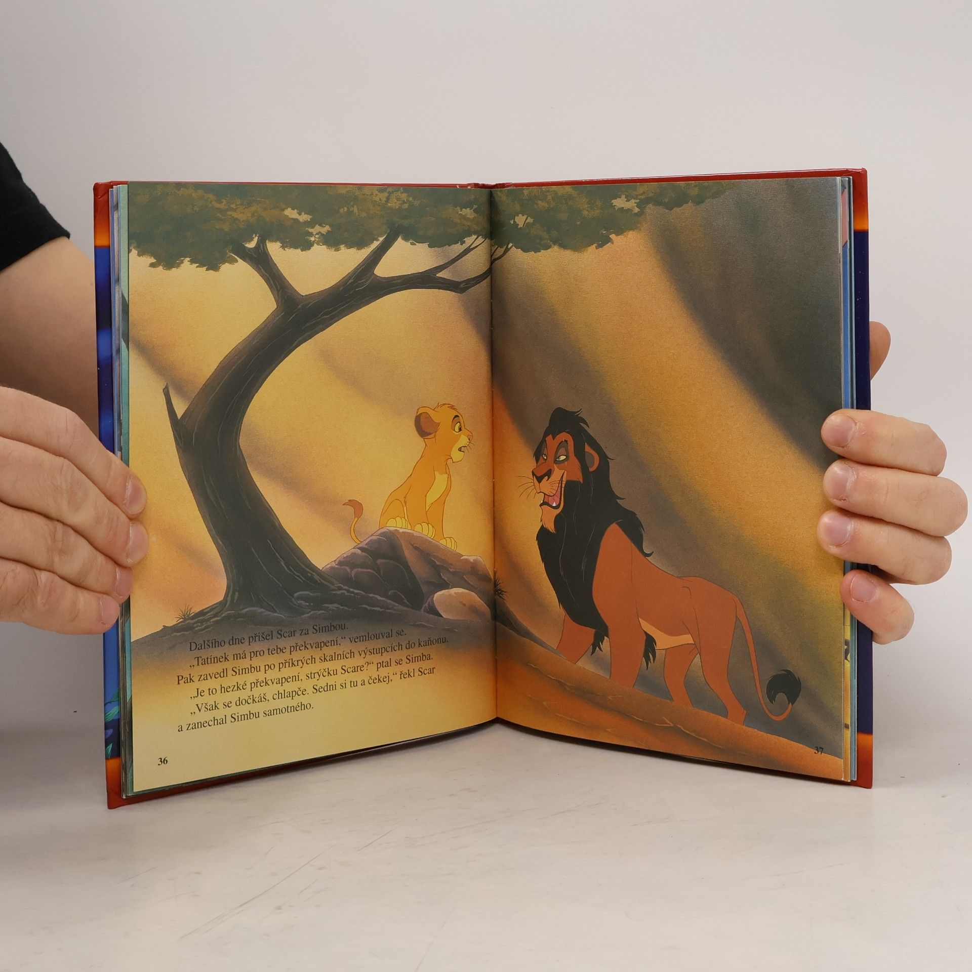 Oranžový kotouč slunce nahlédl prvními žhavými paprsky do nekonečné země písku, skal a stepní trávy a nad tím dílem světa, který lidé pokřtili jménem Afrika, se rozezněly tisíce bubnů a bubínků. Ale to nebouřily bubny! To dusala kopyta zeber a žiraf a dupaly mohutné sloní nohy. A nad bubny vřískaly a pípaly hlasy tisícihlavého sboru dalších zvířat. Všechna spěchala, aby se poprvé poklonila prvorozenému synu lvího krále Mufasy