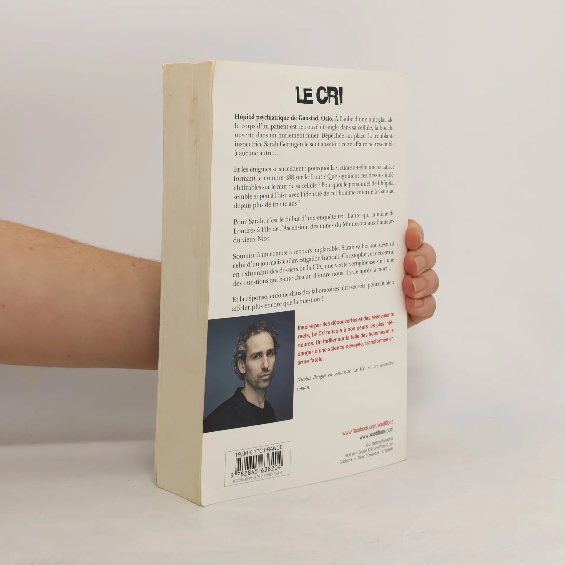Hôpital psychiatrique de Gaustad, Oslo. À l'aube d'une nuit glaciale, le corps d'un patient est retrouvé étranglé dans sa cellule, la bouche ouverte dans un hurlement muet. Dépêchée sur place, la troublante inspectrice Sarah Geringën le sent aussitôt : cette affaire ne ressemble à aucune autre... Et les énigmes se succèdent : pourquoi la victime a-t-elle une cicatrice formant le nombre 488 sur le front ? Que signifient ces dessins indéchiffrables sur le mur de sa cellule ? Pourquoi le personnel de l'hôpital semble si peu à l'aise avec l'identité de cet homme interné à Gaustad depuis plus de trente ans ? Pour Sarah, c'est le début d'une enquête terrifiante qui la mène de Londres à l'île de l'Ascension, des mines du Minnesota aux hauteurs du vieux Nice. Soumise à un compte à rebours implacable, Sarah va lier son destin à celui d'un journaliste d'investigation français, Christopher, et découvrir, en exhumant des dossiers de la CIA, une vérité vertigineuse sur l'une des questions qui hante chacun d'entre nous : la vie après la mort... Et la réponse, enfouie dans des laboratoires ultrasecrets, pourrait bien affoler plus encore que la question ! Inspiré par des découvertes et des événements réels, Le Cri renvoie à nos peurs les plus intérieures. Un thriller sur la folie des hommes et le danger d'une science dévoyée, transformée en arme fatale. Nicolas Beuglet est scénariste. Le Cri est son deuxième roman.