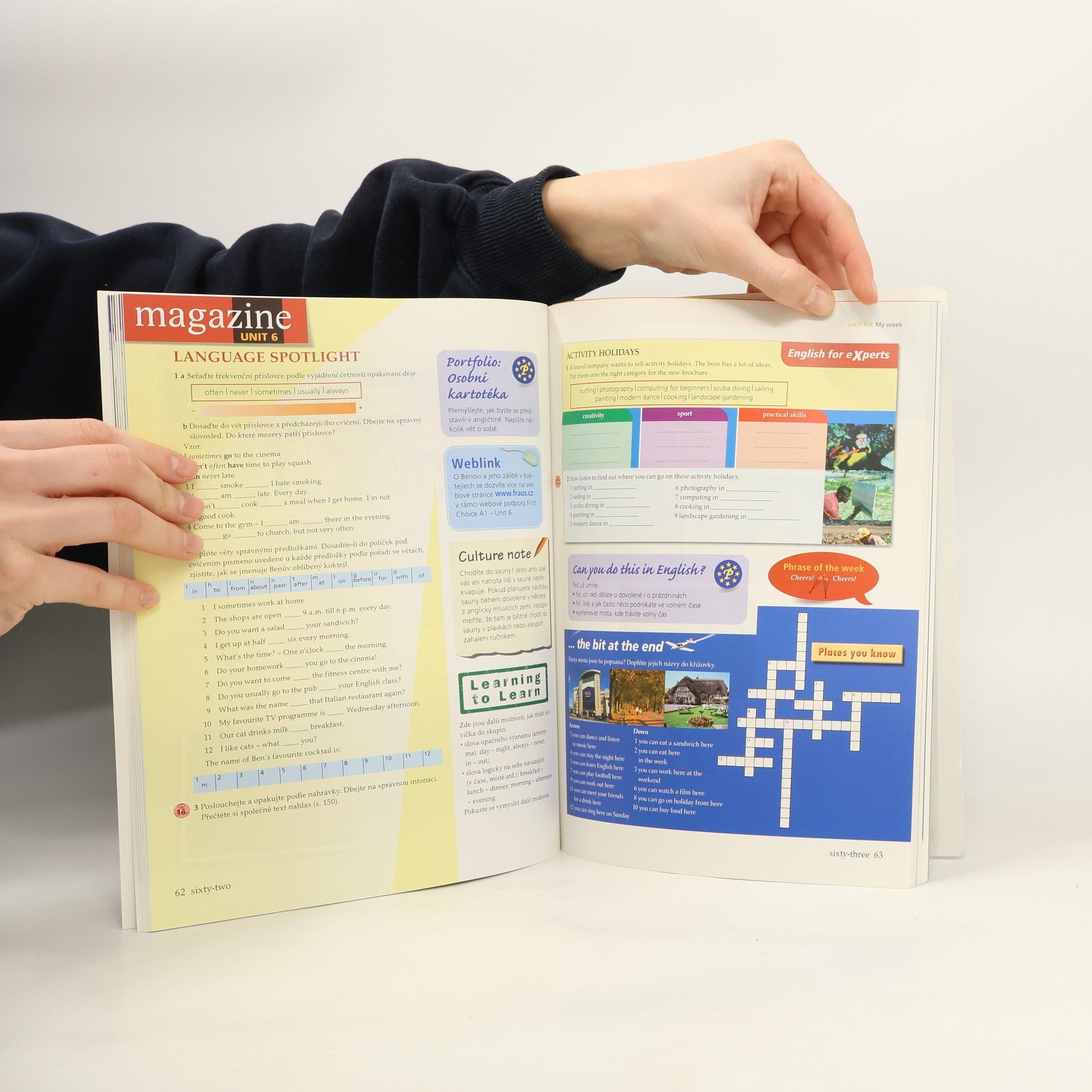 Učebnice A1 obsahuje 12 tematických celků v záhlaví každé lekce jsou shrnuty cíle učebního celku jednotlivé učební celky jsou rozděleny do menších jednotek (Focuses) levý okraj slouží jako navigační lišta, která uvádí bližší informace o daných aktivitách (Speaking, Vocabulary...) řešení reálných životních situací (Tasks) osvědčené typy cvičení k zopakování a upevnění gramatiky a slovní zásoby (Practice) vtipné příběhy a komiksy pro odlehčení (Cartoons) magazínové dvoustrany k samostudiu na konci každé lekce (Magazine - Language Spotlight) systematické opakování probrané gramatiky i slovní zásoby (Quick Check) přehled gramatiky, přepisy nahrávek, abecední slovníček PhraseBook a klíč ke cvičením v závěru učebnice Phrasebook Kromě překladů kmenové slovní zásoby řazené podle lekcí obsahuje také příkladové věty ke každému slovu.
