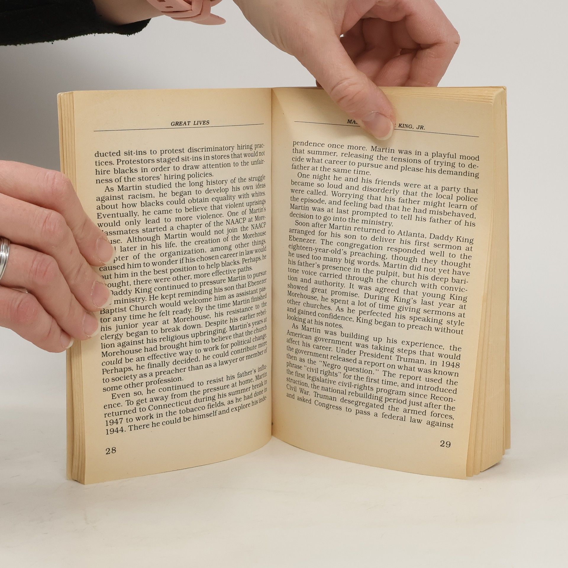 The story of a dynamic leader who believed in freedom and justice for all. King preached nonviolence, using peaceful means in his efforts to end discrimination against American blacks. Even though an assassin's bullets tragically cut King's life short, they failed to tarnish his triumphs or erase his legacy.
