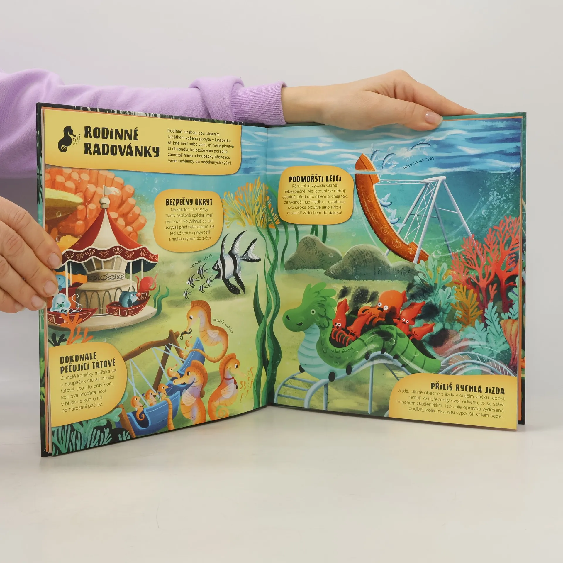Vítej v podmořském lunaparku! Sépie ti u vstupu natiskne inkoustové razítko, a už můžeš dál. Ale kam dřív? Na hřišti v korálovém útesu dovádějí želvy, sardinky se tísní v kabinkách vyhlídkového kola, mořský ďas je hlavním lákadlem strašidelného vraku, a pokud se unavíš, popoveze tě dobrácký rejnok. Při návštěvě podmořského lunaparku se dozvíš spoustu zajímavostí o mořských zvířatech a den ti uteče jako voda.