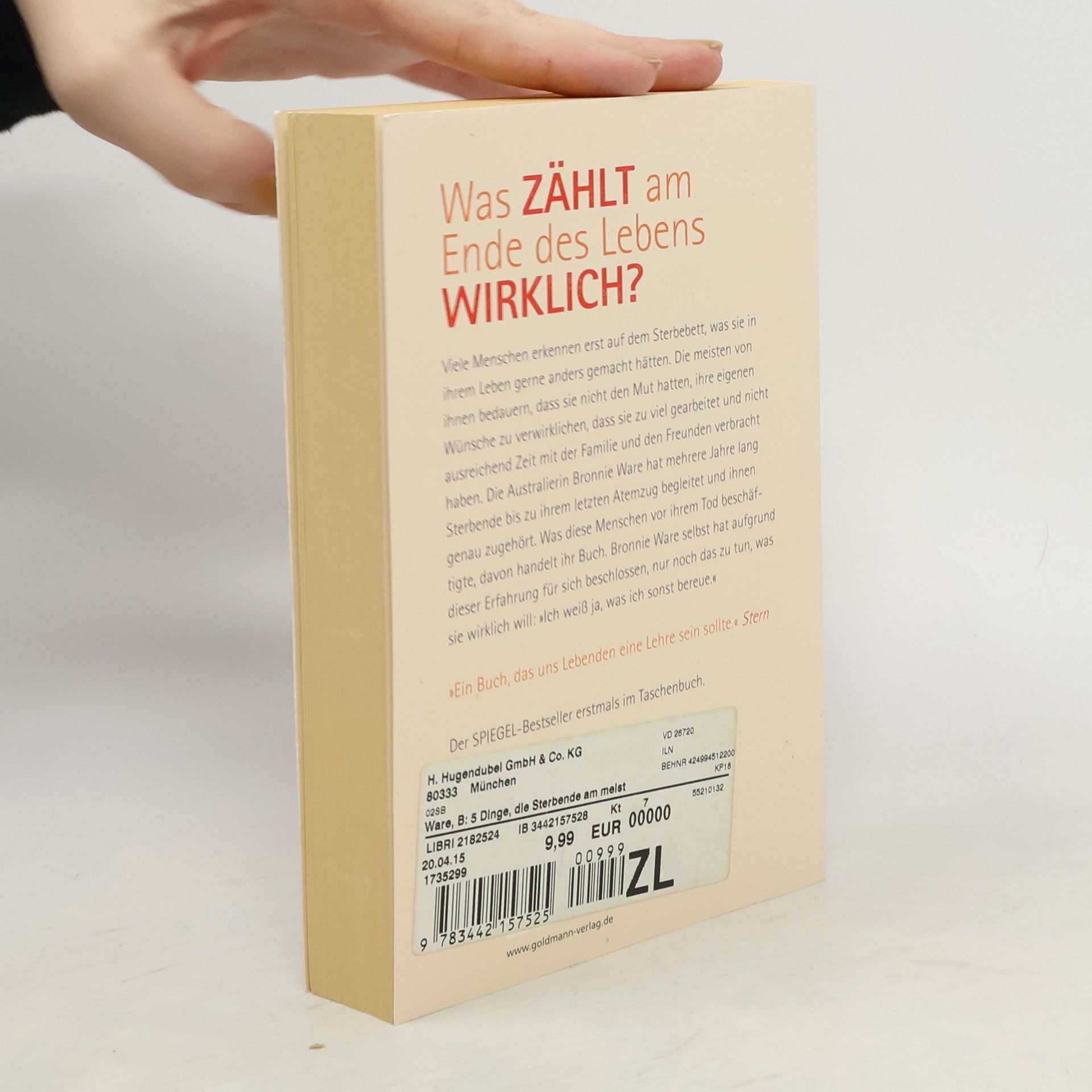 Was zählt am Ende des Lebens wirklich? Wenn man mit dem Tod konfrontiert ist, geht es nicht mehr um Geld. Um Macht. Um Ruhm. Sondern um ganz fundamentale Fragen: Hat man ausreichend Zeit mit der Familie und den Freunden verbracht? Bereut man es, Dinge getan oder, noch wichtiger, unterlassen zu haben? War man glücklich? Die Australierin Bronnie Ware hat mehrere Jahre lang Sterbende bis zu ihrem letzten Atemzug begleitet und ihnen genau zugehört. Was diese Menschen vor ihrem Tod beschäftigte, davon handelt ihr Buch. Ware selbst hat aufgrund dieser Erfahrung beschlossen, nur noch das zu tun, was sie wirklich will. Denn, so sagt sie, „ich weiß ja, was ich sonst bereue.“
