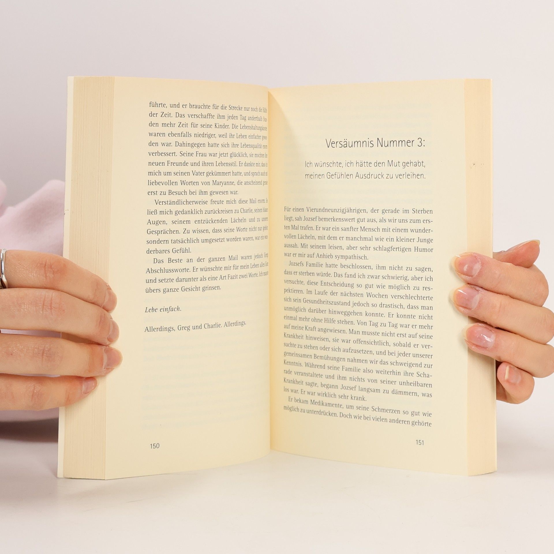 Was zählt am Ende des Lebens wirklich? Wenn man mit dem Tod konfrontiert ist, geht es nicht mehr um Geld. Um Macht. Um Ruhm. Sondern um ganz fundamentale Fragen: Hat man ausreichend Zeit mit der Familie und den Freunden verbracht? Bereut man es, Dinge getan oder, noch wichtiger, unterlassen zu haben? War man glücklich? Die Australierin Bronnie Ware hat mehrere Jahre lang Sterbende bis zu ihrem letzten Atemzug begleitet und ihnen genau zugehört. Was diese Menschen vor ihrem Tod beschäftigte, davon handelt ihr Buch. Ware selbst hat aufgrund dieser Erfahrung beschlossen, nur noch das zu tun, was sie wirklich will. Denn, so sagt sie, „ich weiß ja, was ich sonst bereue.“