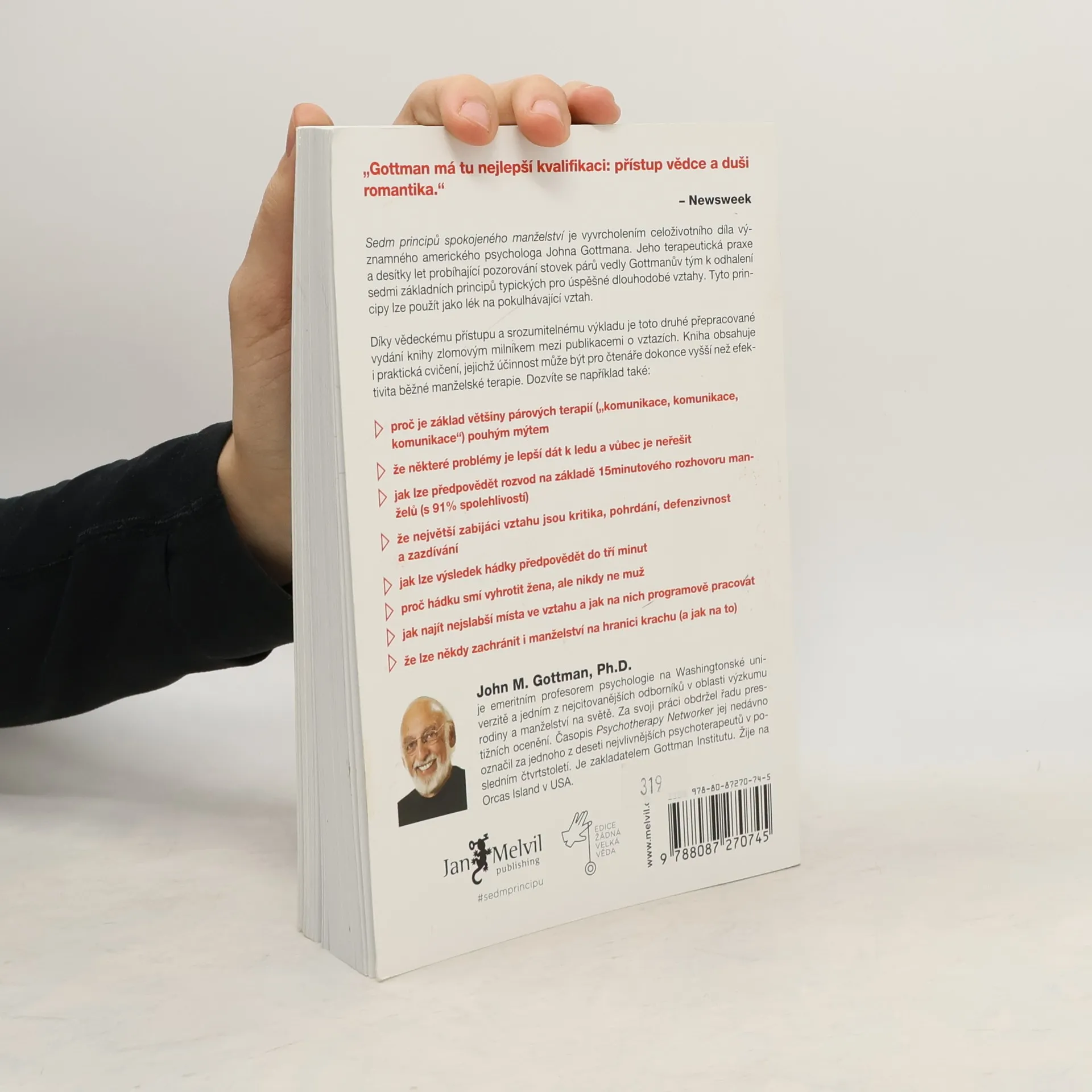 „Sedm principů spokojeného manželství“ představuje vrchol celoživotního díla amerického psychologa Johna Gottmana, jednoho z nejvlivnějších odborníků na manželství a rodičovství. Díky více než dvacetiletému výzkumu nabízí Gottman hluboký vhled do dynamiky partnerských vztahů. Autor zahájil svůj výzkum v roce 1992 se 700 novomanželskými páry, které si nahrávaly 15minutové rozhovory. Analýzou těchto záznamů předpověděl, zda páry vydrží dalších deset let, s úspěšností 94 %. Klíčovým faktorem pro úspěch vztahu se ukázal být poměr pozitivních a negativních interakcí, přičemž páry, které zůstaly spolu, měly pětkrát více pozitivních interakcí než negativních. Gottman se zaměřuje na mýty o komunikaci a identifikuje destruktivní vzorce, které mohou vést k rozchodu. Kniha obsahuje profily párů, které se dokázaly zachránit, a také příběhy těch, kteří proplouvají životem společně. Čtenáři najdou dotazníky a cvičení, které pomohou identifikovat problémy ve vztahu a zaměřit se na jejich řešení. První vydání knihy vyšlo v roce 1999 a stalo se bestsellerem, přičemž aktualizované vydání z roku 2015 přináší nejnovější výzkumy.