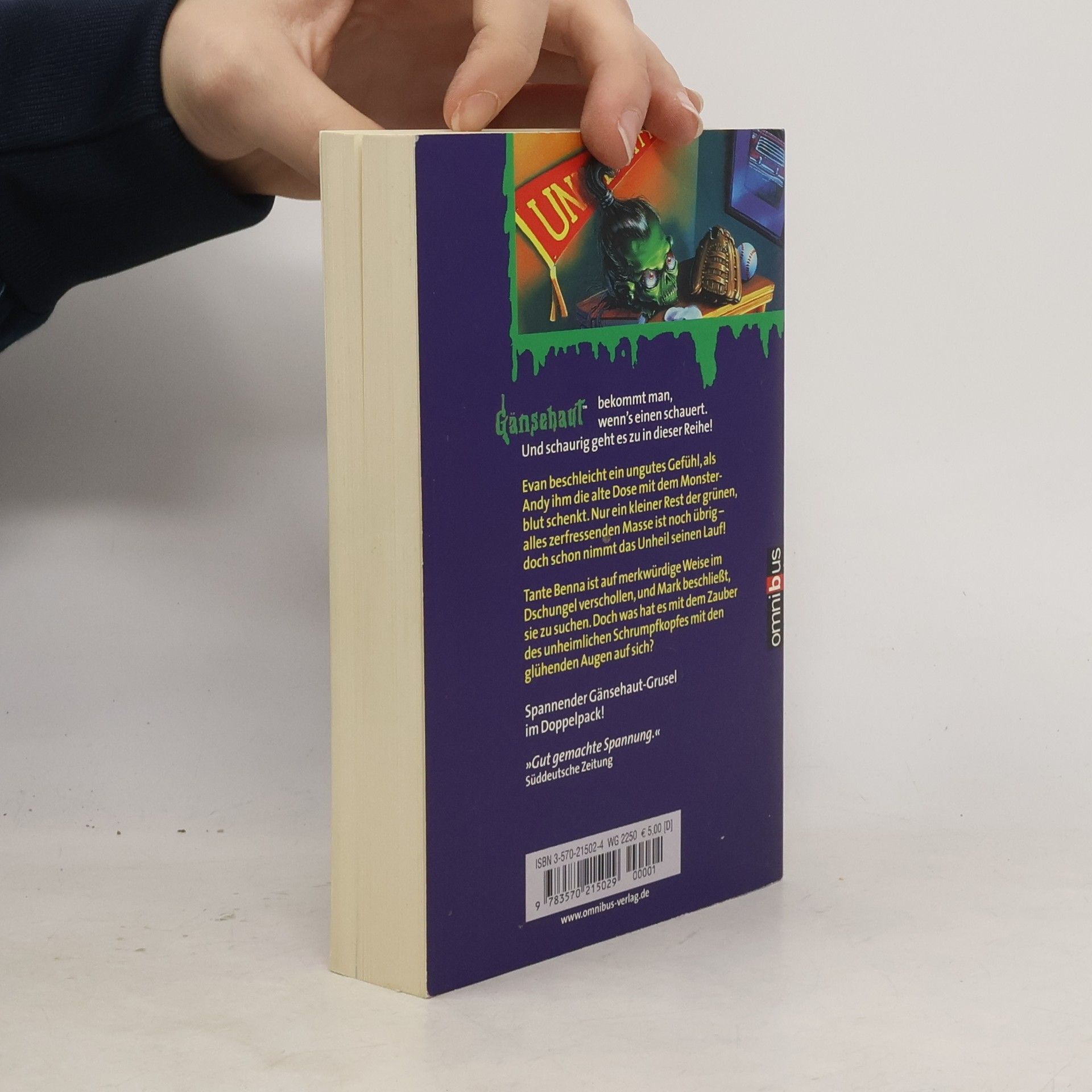 Enthält die Gänsehaut-Einzelbände 'Es wächst weiter' (Band 27) und 'Der Kopf mit den glühenden Augen' (Band 28). 'Es wächst weiter' Evan, eifrigen Gänsehaut-Lesern bekannt aus „Es wächst und wächst und wächst“, wohnt seit einiger Zeit in einer neuen Stadt, wo er noch keine Freunde gefunden hat. Eines Tages taucht seine alte Freundin Andy auf, die ihm ein Geschenk mitbringt: die alte Dose mit Monsterblut. Die Gefahr des Monsterblutes ist inzwischen hinlänglich bekannt, doch Andy kann der Versuchung nicht widerstehen, die Kraft dieser unheimlichen Substanz noch einmal einzusetzen. 'Der Kopf mit den glühenden Augen' Mark reist in die Südsee, um seine Tante, eine berühmte Wissenschaftlerin, zu besuchen. Doch Tante Benna ist wie vom Erdboden verschluckt. Mit der gleichaltrigen Karin macht sich Mark auf die Suche, wobei ihm der Schrumpfkopf mit den glühenden Augen, ein Geschenk seiner Tante, den Weg weist. Im Dschungel lauern viele Gefahren auf die beiden: bissige rote Riesenameisen, Treibsand, wilde Tiere. Doch mit Hilfe der Magie des Schrumpfkopfes gelingt es Mark, das Abenteuer unbeschadet zu überstehen.