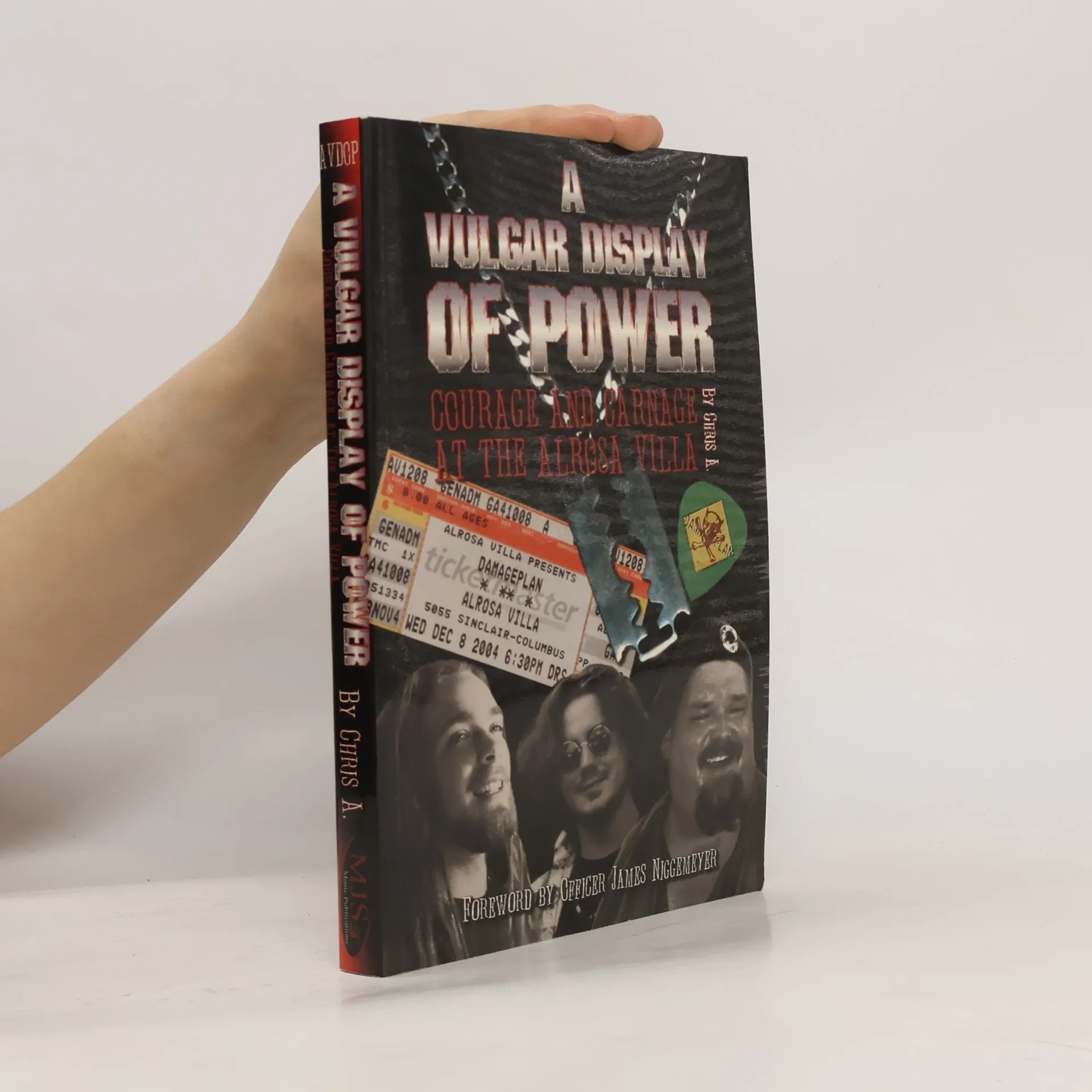 A modern, true story of good vs. evil. Heavy Metal guitarist, Dimebag Darrell Abbott, was attacked and murdered on stage, December 8th, 2004 at the Alrosa Villa Nightclub. Erin Halk, Jeff Thompson and Nathan Bray each lost their lives trying to help Dimebag and others from the attack of an armed madman. While Dimebag is certainly a part of the story contained within the book, the focus is squarely on the background of Halk, Bray & Thompson, in addition to the killer, his motives and the actual incident at the venue. "A Vulgar Display Of Power: Courage And Carnage At The Alrosa Villa" is a deep, moving story which does an amazing job of honoring the memories Jeff, Nate, Erin, and Darrell. Of the victims who lost their lives, Nathan Bray is the only person who is survived by a wife and child. MJS Music Publications is contributing proceeds from every copy sold to a college fund set up for his son, Anthony. Music History/True Crime/Biography 352 pages, 240+ pictures.