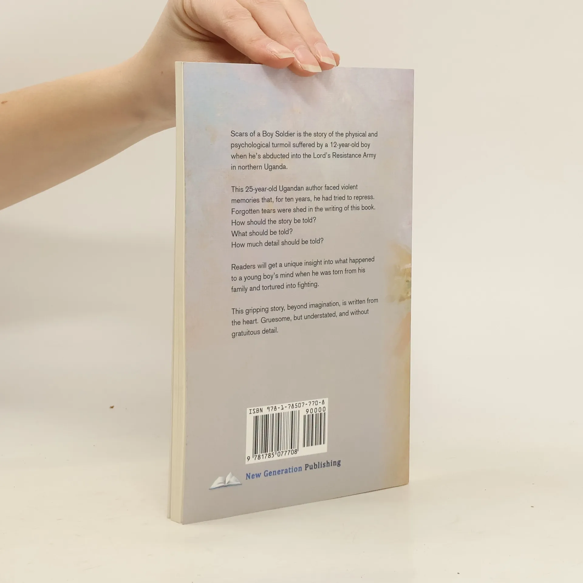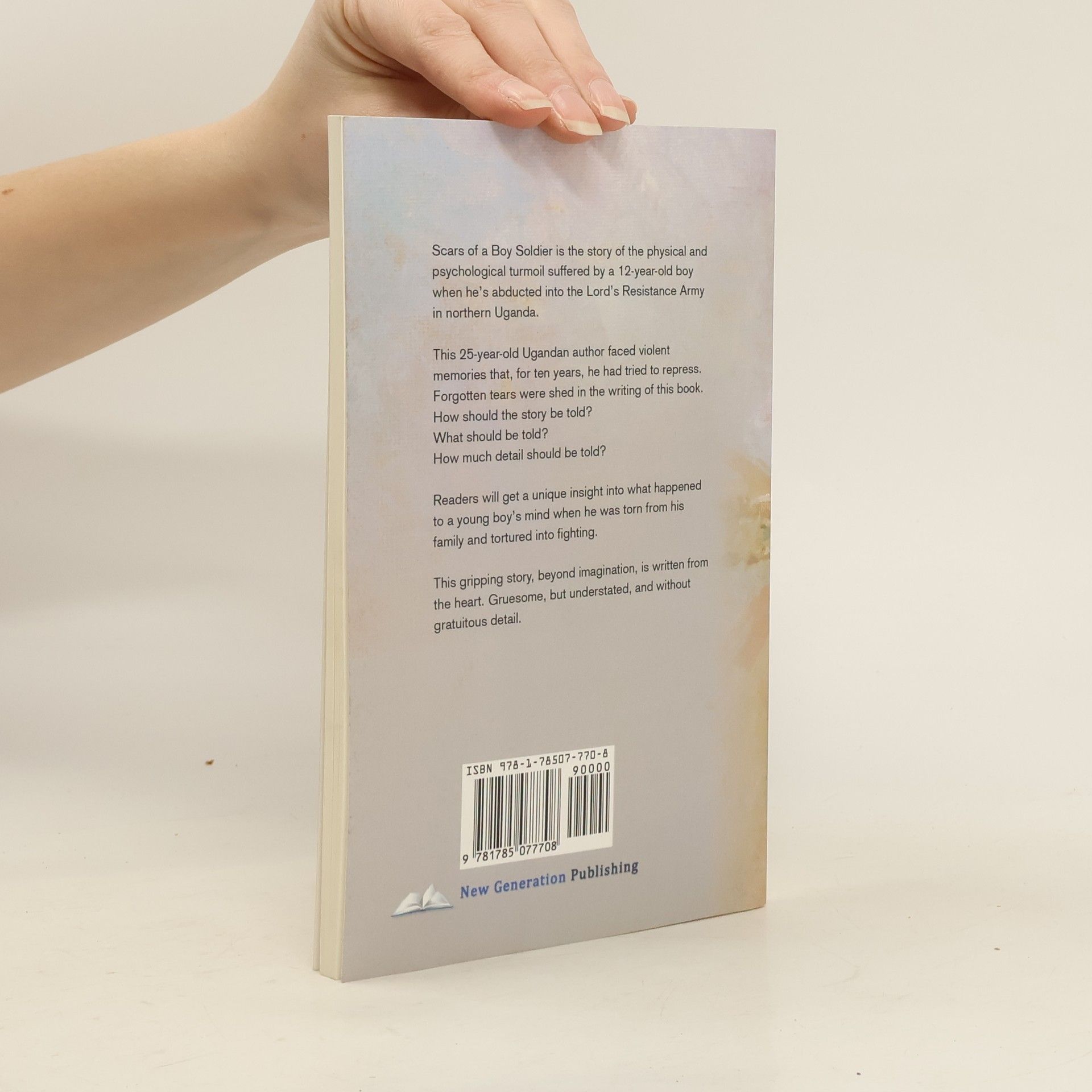 Scars of a Boy Soldier is the story of the physical and psychological turmoil suffered by a 12-year-old boy when he's abducted into the Lord's Resistance Army in northern Uganda. This 25-year-old Ugandan author faced violent memories that, for ten years, he had tried to repress.Forgotten tears were shed in the writing of this book.How should the story be told?What should be told?How much detail should be told? Readers will get a unique insight into what happened to a young boy's mind when he was torn from his family and tortured into fighting. This gripping story, beyond imagination, is written from the heart. Gruesome, but understated, and without gratuitous detail.