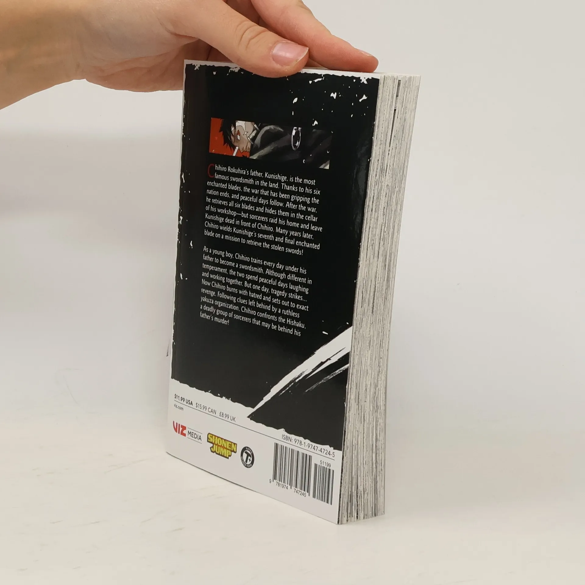 Chihiro's cursed past sends him down a quest of bloody vengeance! Chihiro Rokuhira's father, Kunishige is the most famous swordsmith in the land. Thanks to his six enchanted blades, the war that had been gripping the nation ended and peaceful days followed. After the war, he retrieved all six blades and hid them in the cellar of his workshop. However, sorcerers raided his home, stole the legendary swords, and left Kunishige dead in front of Chihiro. Now Chihiro wields Kunishige’s seventh and final enchanted blade on a mission to exact revenge and retrieve the swords his father forged. As a young boy, Chihiro trained every day under his father to become a swordsmith. The two, although different in temperament, spent endless peaceful days laughing and working, but one day, tragedy struck… Now Chihiro burns with hatred and is determined to exact revenge on those who killed his father!