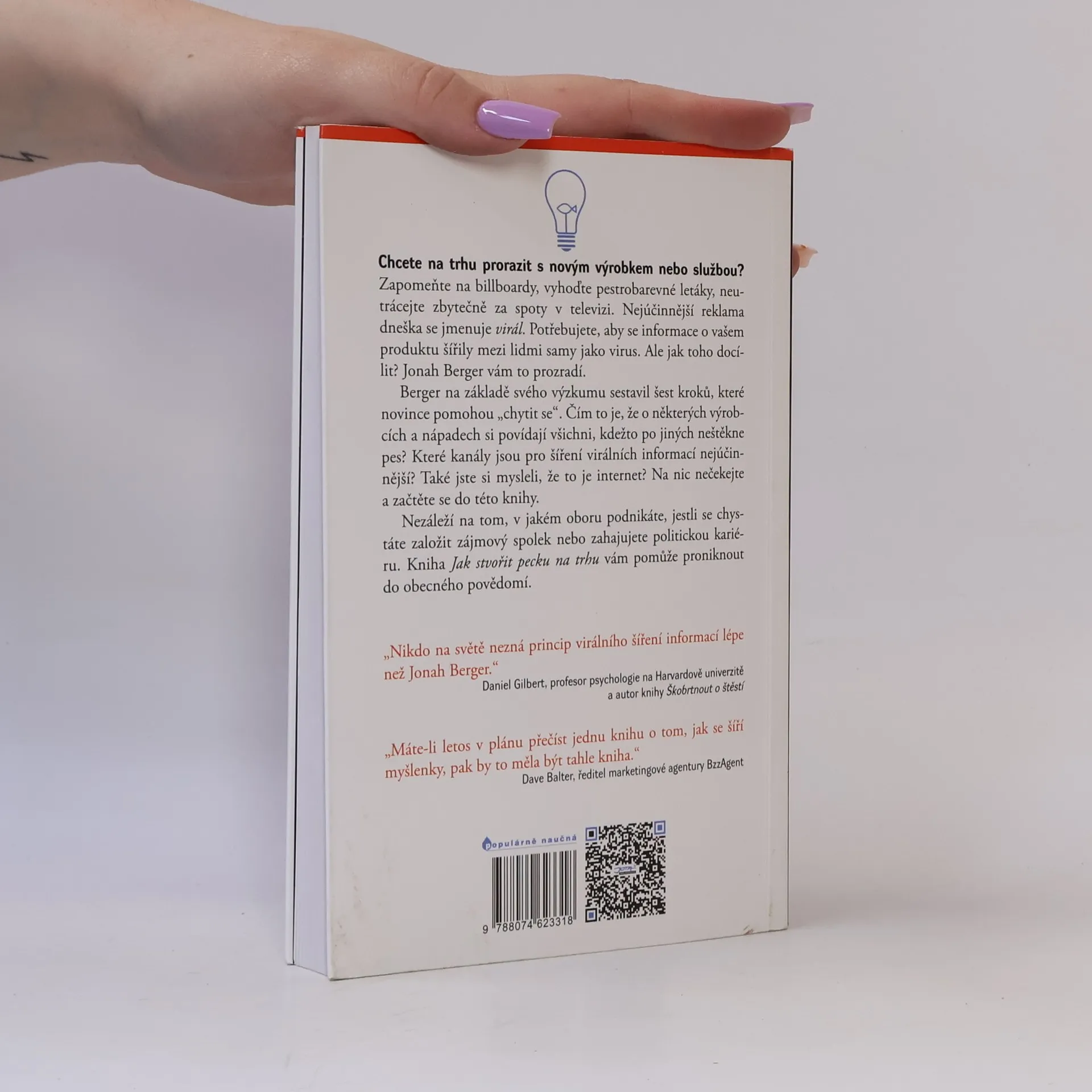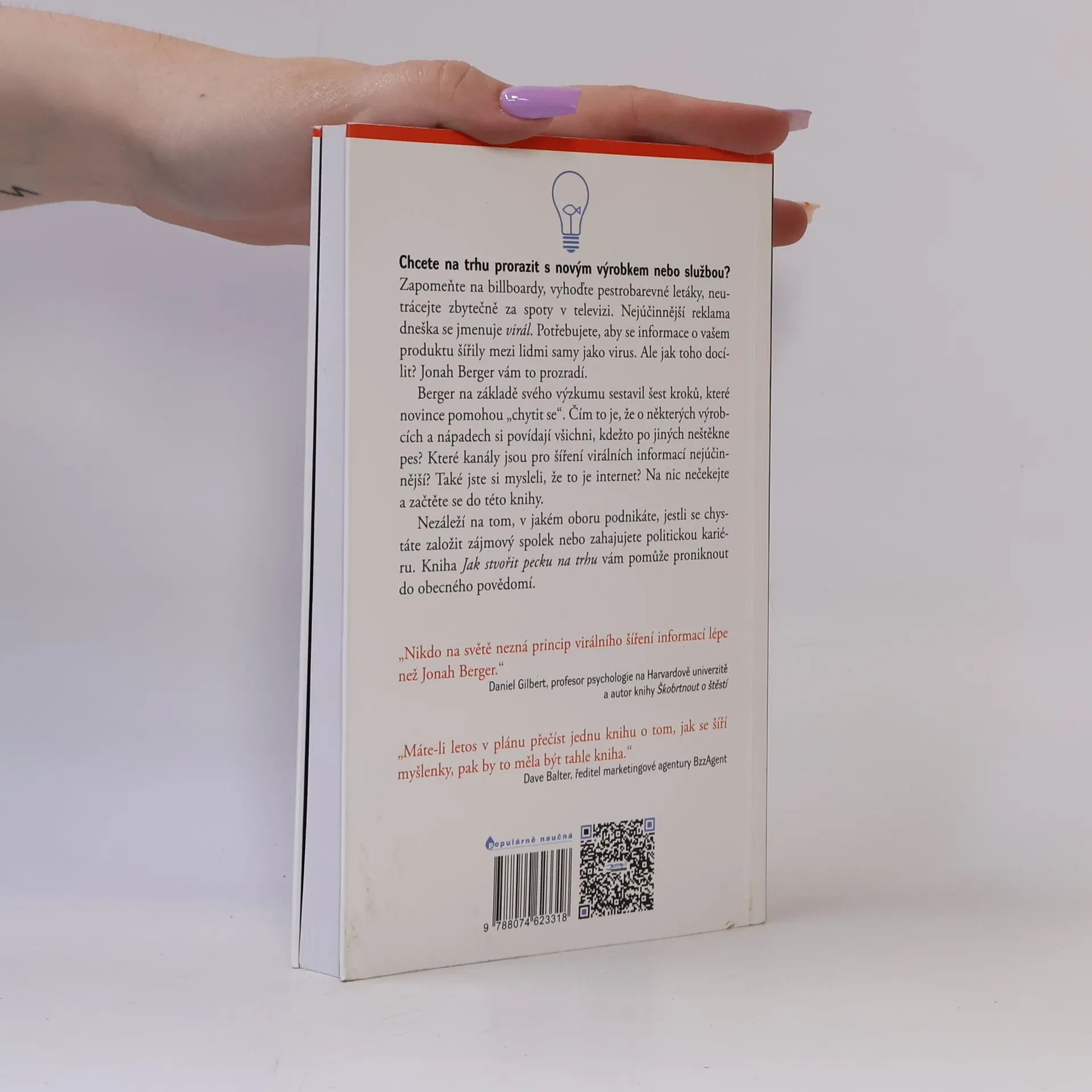 Proč o některých výrobcích mluvíme raději než o jiných? Proč se některé klipy a články na internetu šíří bleskovou rychlostí, kdežto jiné zapadnou? Výrobky, myšlenky a vzorce chování, o kterých si lidé povídají, se uchytí lépe než ty ostatní. Informace šířená od úst k ústům a mezi známými je zkrátka účinnější než plánovitá reklamní kampaň. Umíte o svém produktu vyslat takovou informaci, aby se šířila řetězovou reakcí? Jonah Berger vám ukáže, jak na to. Nezáleží na tom, jestli provozujete malou restauraci, řídíte velkou firmu nebo poprvé kandidujete do místního zastupitelstva. Existují univerzální tipy, které z vašeho zboží nebo myšlenky udělají žhavý módní trend. V knize Jak stvořit pecku na trhu vás Berger seznámí s výsledky vlastního výzkumu. Užasnete třeba nad tím, jaké množství informací si sdělíme po internetu a jaké jinými cestami. Knihu doporučují autoři bestsellerů jako Dan Ariely a Daniel Gilbert, byla vydána už v devíti zemích a pro toho, kdo chce prosadit své plány a nápady, je přímo povinnou četbou.