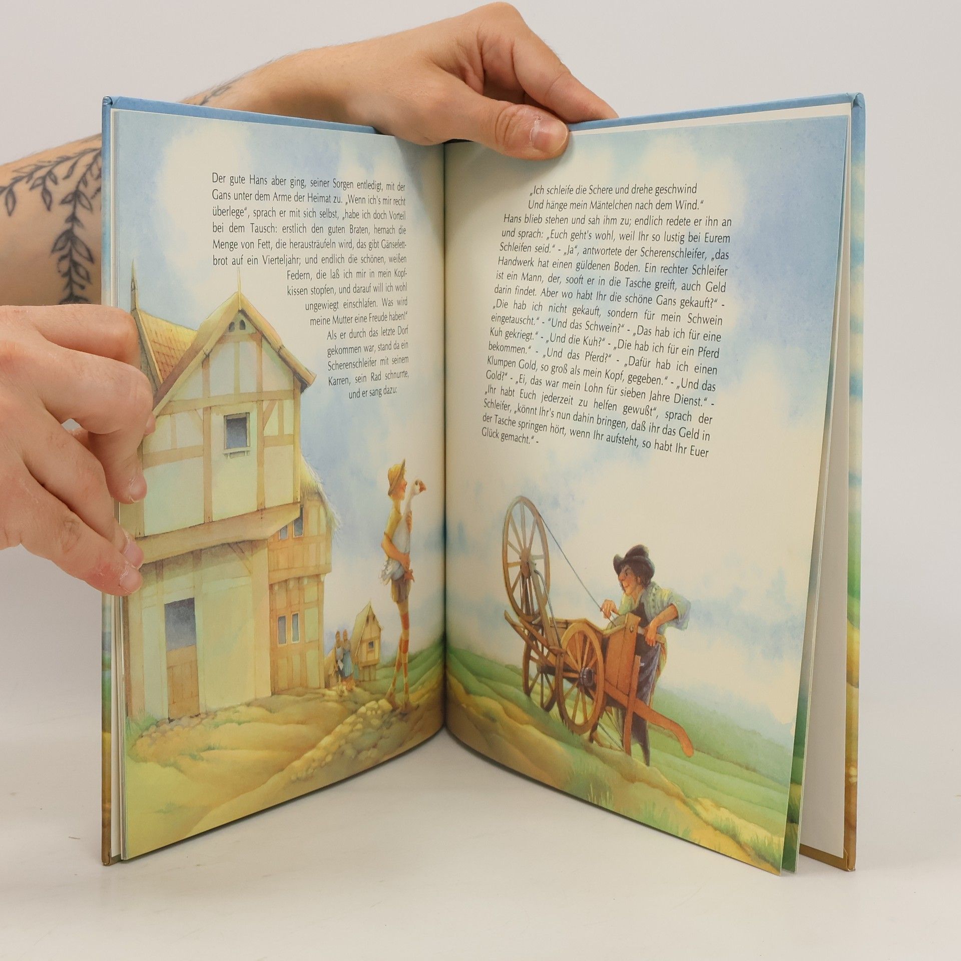 Seinen Lohn für sieben Jahre ehrliche Arbeit, einen Klumpen Gold, tauscht Hans so lange, bis er nur noch einen Stein hat. Und als dieser in einen Brunnen fällt, fühlt er sich glücklich und von aller Last befreit