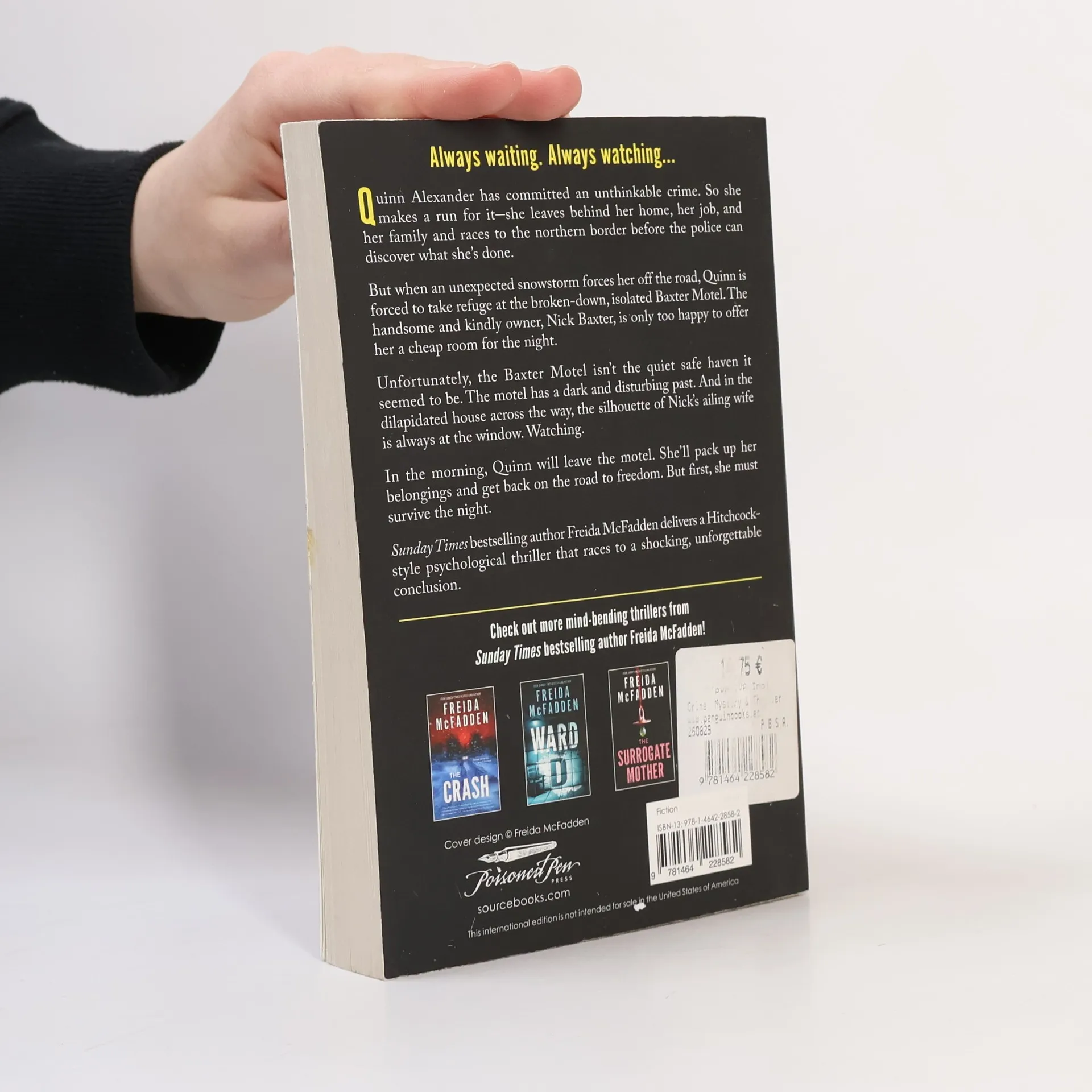 From #1 Sunday Times bestselling author Freida McFadden comes a story of sinister secrets... Quinn Alexander has committed an unthinkable crime. To avoid spending her life in prison, Quinn makes a run for it. She leaves behind her home, her job, and her family. She grabs her passport and heads for the northern border before the police can discover what she's done. But when an unexpected snowstorm forces her off the road, Quinn must take refuge at the broken-down, isolated Baxter Motel. The handsome and kindly owner, Nick Baxter, is only too happy to offer her a cheap room for the night. Unfortunately, the Baxter Motel isn't the quiet, safe haven it seemed to be. The motel has a dark and disturbing past. And in the dilapidated house across the way, the silhouette of Nick's ailing wife is always at the window. Always watching. In the morning, Quinn must leave the motel. She'll pack up her belongings and get back on the road to freedom.