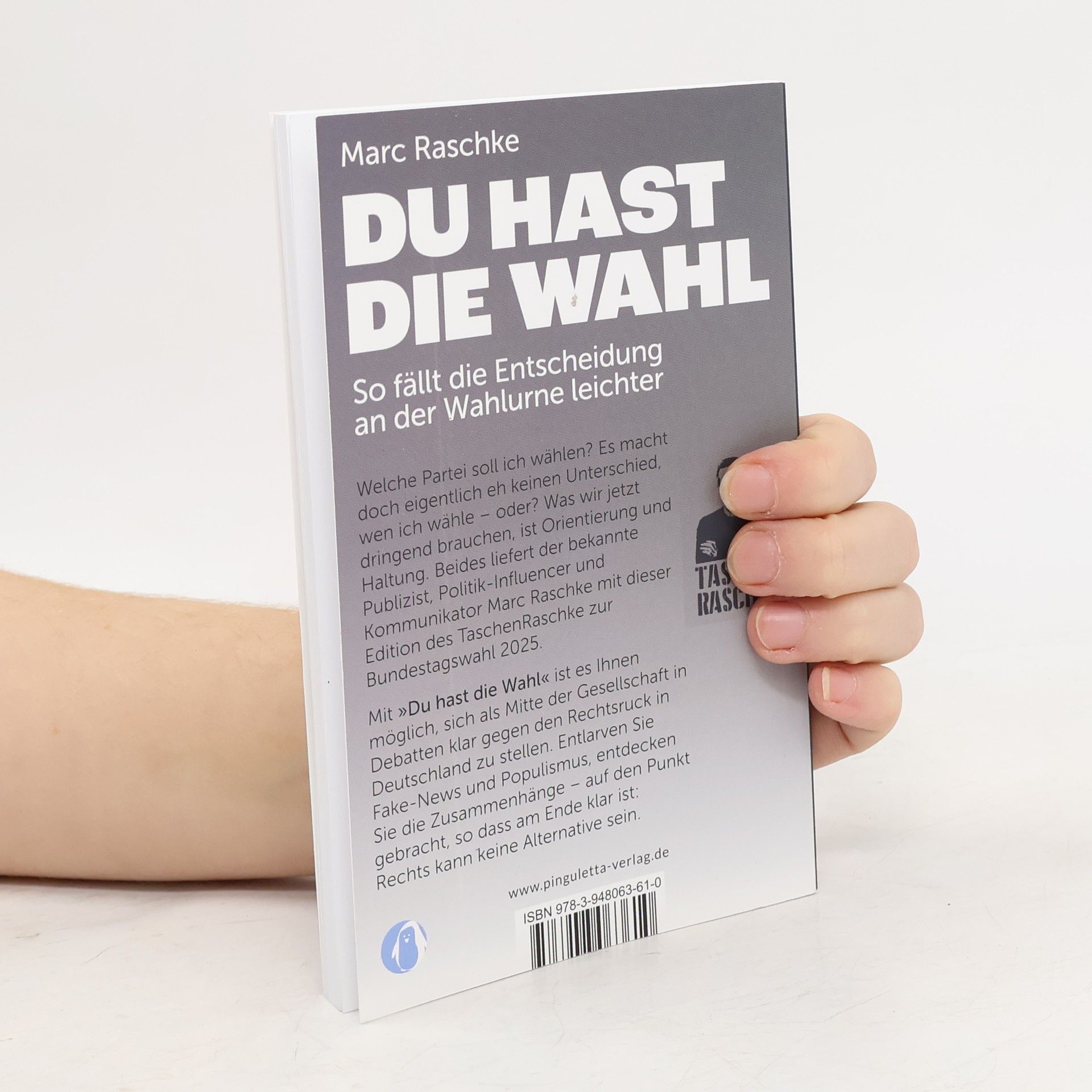 Welche Partei soll ich wählen? Es macht doch eigentlich eh keinen Unterschied, wen ich wähle – oder? Was wir jetzt dringend brauchen, ist Orientierung und Haltung. Beides liefert der bekannte Publizist, Politik-Influencer und Kommunikator Marc Raschke mit dieser Edition des TaschenRaschke zur Bundestagswahl 2025. Mit „Du hast die Wahl“ ist es Ihnen möglich, sich als Mitte der Gesellschaft in Debatten klar gegen den Rechtsruck in Deutschland zu stellen. Entlarven Sie Fake-News und Populismus, entdecken Sie die Zusammenhänge – auf den Punkt gebracht, so dass am Ende klar ist: Rechts kann keine Alternative sein.