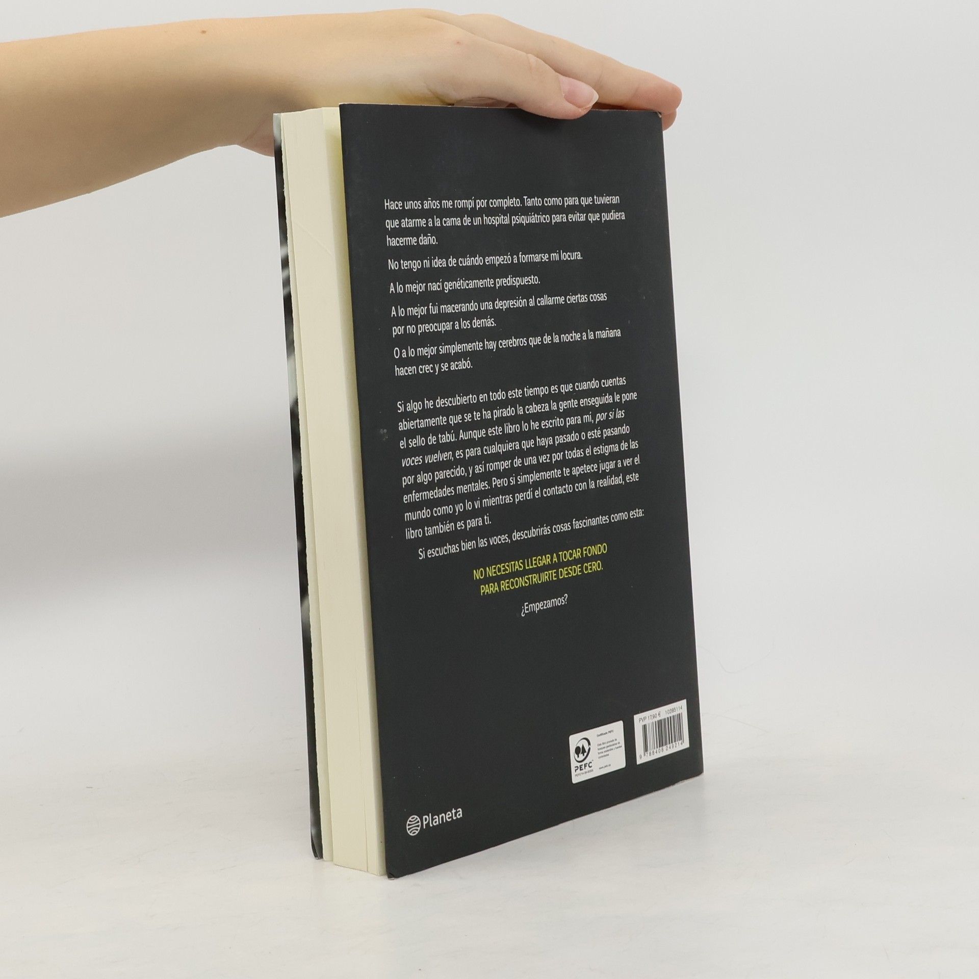 Hace unos años me rompí por completo. Tanto como para que tuvieran que atarme a la cama de un hospital psiquiátrico para evitar que pudiera hacerme daño.No tengo ni idea de cuándo empezó a formarse mi locura.A lo mejor nací genéticamente predispuesto.A lo mejor fui macerando una depresión callándome ciertas cosas por no preocupar a los demás.O a lo mejor simplemente hay cerebros que de la noche a la mañana hacen crec y se acabó.Si algo he descubierto en todo este tiempo es que cuando cuentas abiertamente que se te ha pirado la cabeza, la gente enseguida le pone el sello de tabú.Aunque este libro lo he escrito para mí, por si las voces vuelven, es para cualquiera que haya pasado o esté pasando por algo parecido, y así romper de una vez por todas el estigma de las enfermedades mentales. Pero si simplemente te apetece jugar a ver el mundo como yo lo vi mientras perdí el contacto con la realidad, este libro también es para ti. Si escuchas bien las voces, descubrirás cosas fascinantes como esta:NO NECESITAS LLEGAR A TOCAR FONDO PARA RECONSTRUIRTE DESDE CERO¿Empezamos?Un sorprendente testimonio sobre la locura. Un relato en primera persona sobre lo que supone perderse y tener que reconstruirse desde cero. Una historia vitalista que te agarra desde la primera línea.