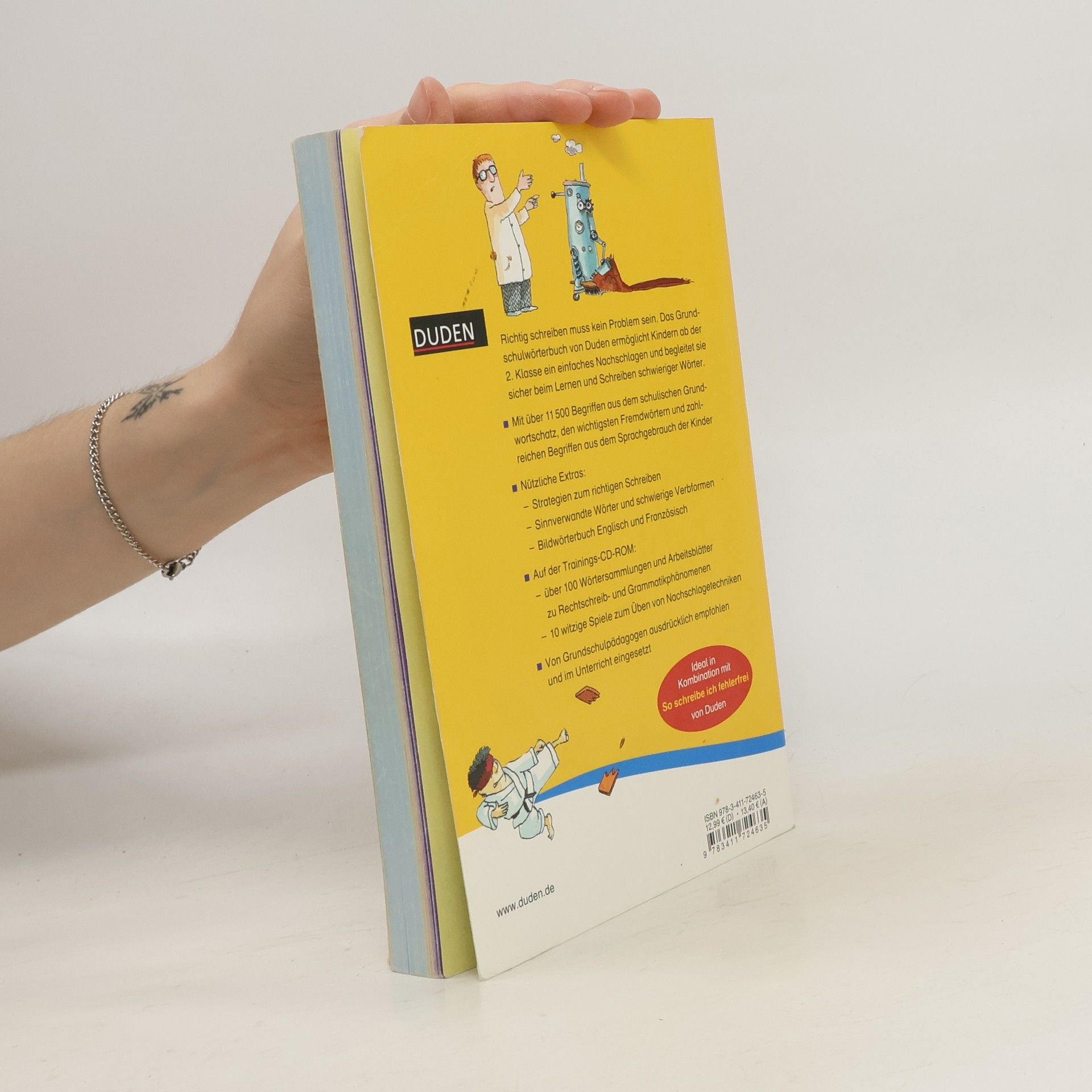 Dieses Wörterbuch enthält mit 11 500 Begriffen den Wortschatz für die Grundschulzeit und ermöglicht Kindern ab der 2. Klasse ein einfaches Nachschlagen. Es begleitet sie sicher beim Lernen und Schreiben schwieriger Wörter. Bunte Suchhilfen erleichtern das rasche Finden der Wörter. Im Anhang finden sich nützliche Extras wie ein Bildwörterbuch Englisch und Französisch, Strategien für eine bessere Rechtschreibung, eine Übersicht schwieriger Wörter, die oft falsch geschrieben werden, sowie eine Liste sinnverwandter Wörter. Inklusive einer CD-ROM zum Üben mit interaktiven Spielen, Arbeitsblättern und Wörtersammlungen. (Quelle: Homepage des Verlags).